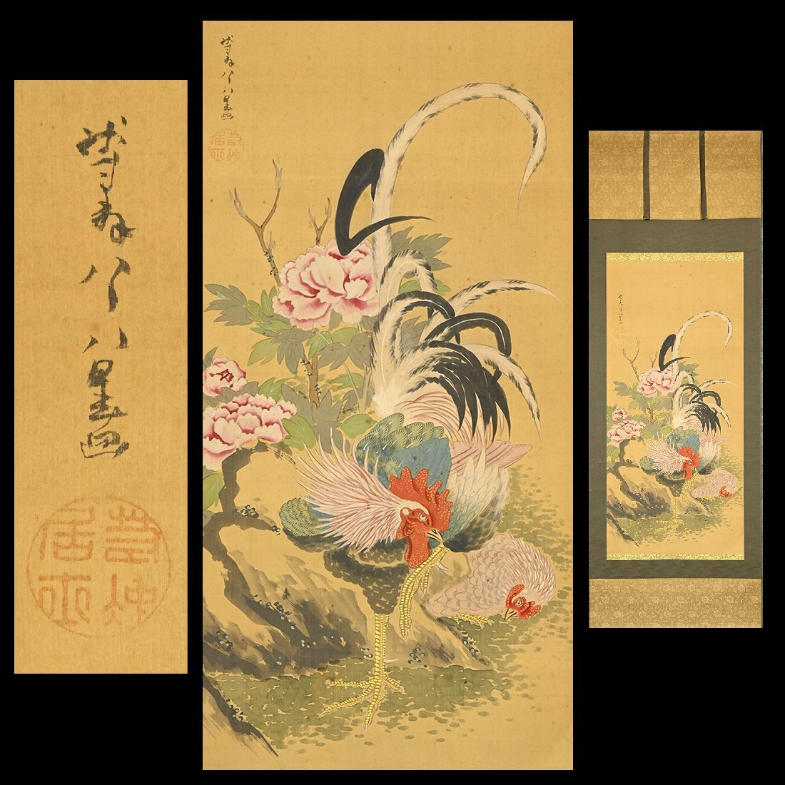 【永】b051【兵庫県の図書館や博物館の館長を歴任された歴史研究家遺族委託品】掛軸 伊藤若冲 細密彩色鶏画 花鳥画日本画