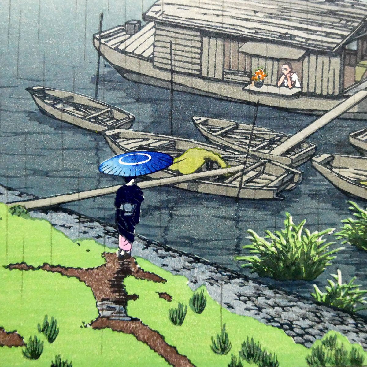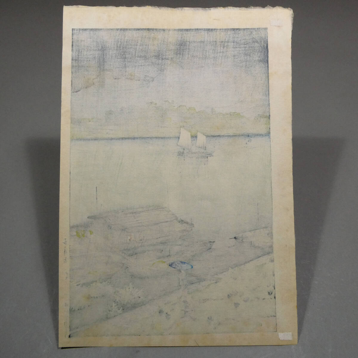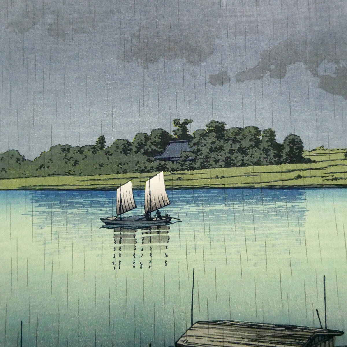今回のお品は、巴水の木版画作品、「五月雨(荒川)」です。