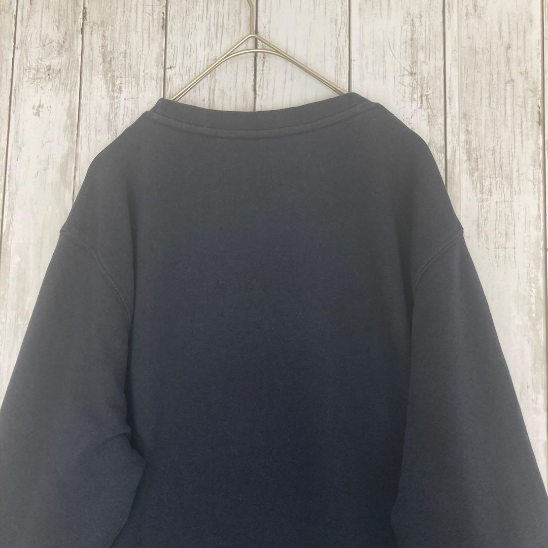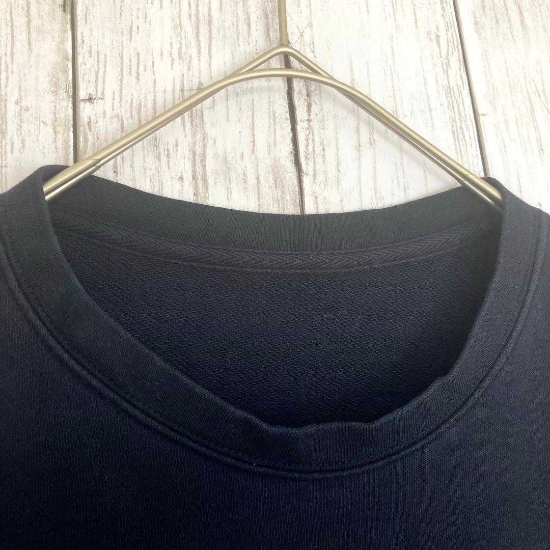 ネイビーのクルーネックトレーナー、コットン混合素材で快適な着心地。