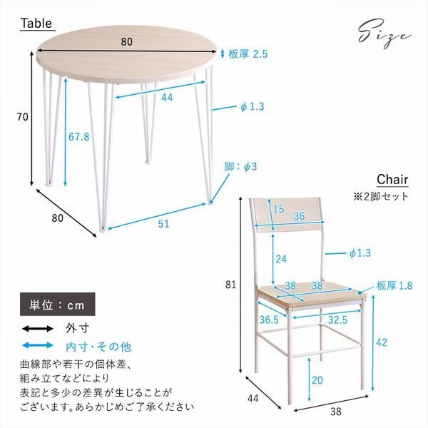 【カラー】 ホワイトオーク 【サイズ】 テーブル:W80×D80×H70cm チェア:W38×D44×H81cm 【重量】 テーブル:11kg チェア:3.8kg(1脚) 【素材】 主材:スチール MDF 表面加工:粉体塗装 PVC 【梱包】 サイズ:W89×D86×H14cm、重量:21.65kg 【組み立て品】 お客様による組み立てが必要です。 【ご注意】 ・サイズ、重量は概算です。 ・商品カラーはご使用のモニターによって実際の明るさや色と異なって見える場合がございます。 |