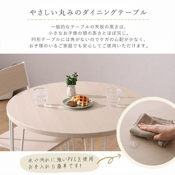 天板サイズ80cm幅のさわやかな円形ダイニング3点セット! ホワイトスチールと木目の相性がバッチリです。 2人掛けにはちょうどいいサイズです。 円形だとコミュニケーションがとりやすくなるので、お互いの顔が見やすく楽しく過ごせます。 角型テーブルじゃないので、角にぶつかってもケガの心配がないです。 どこからでも座ることができ、席に座りやすいのが特徴です。 イスは背もたれ付きなのでゆったり座れます。 |