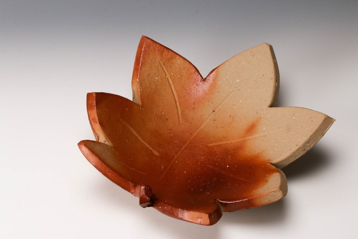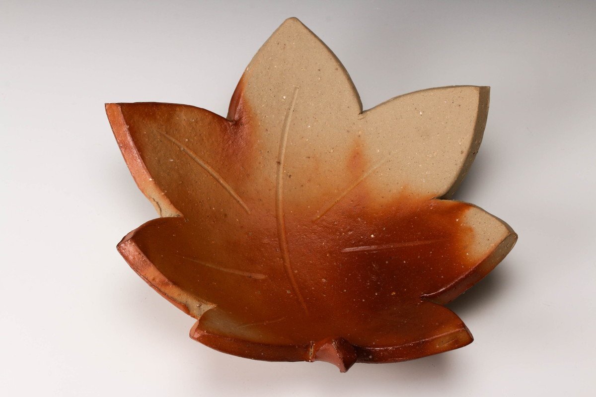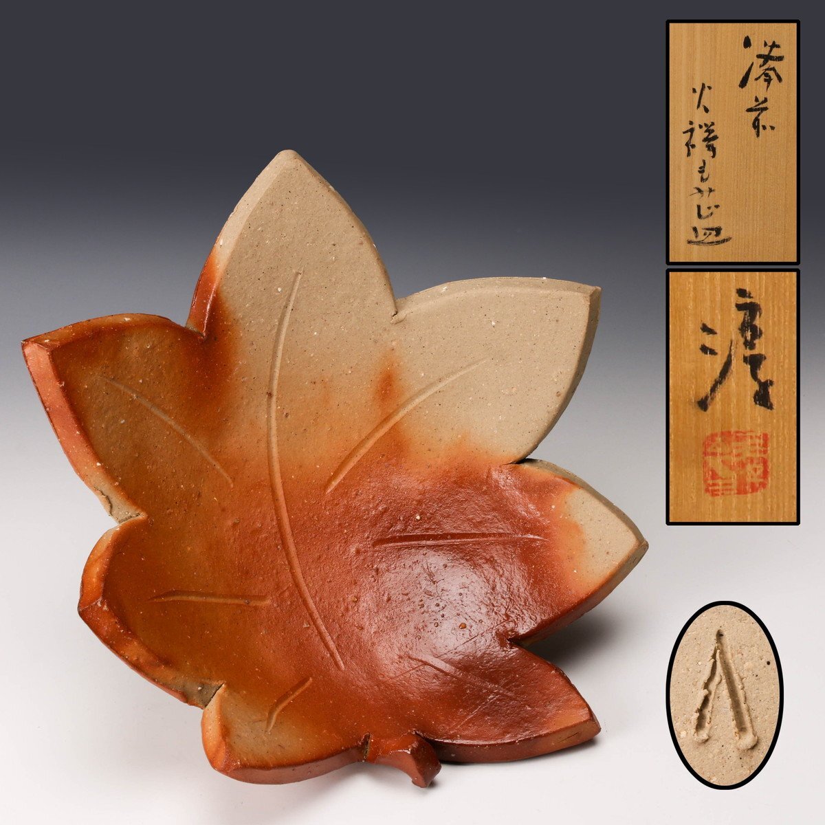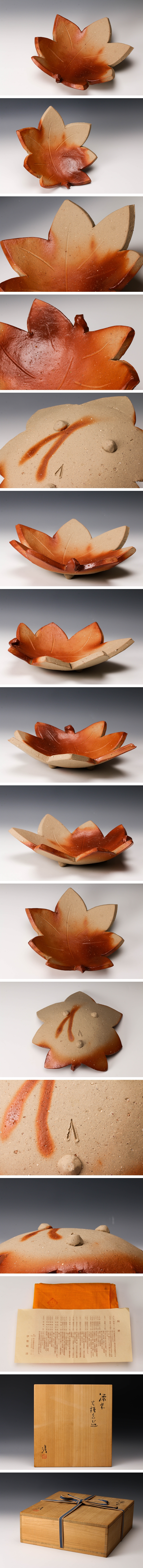 【佳香】人間国宝 伊勢崎淳 備前緋襷もみじ皿 共箱 共布 栞 本物保証