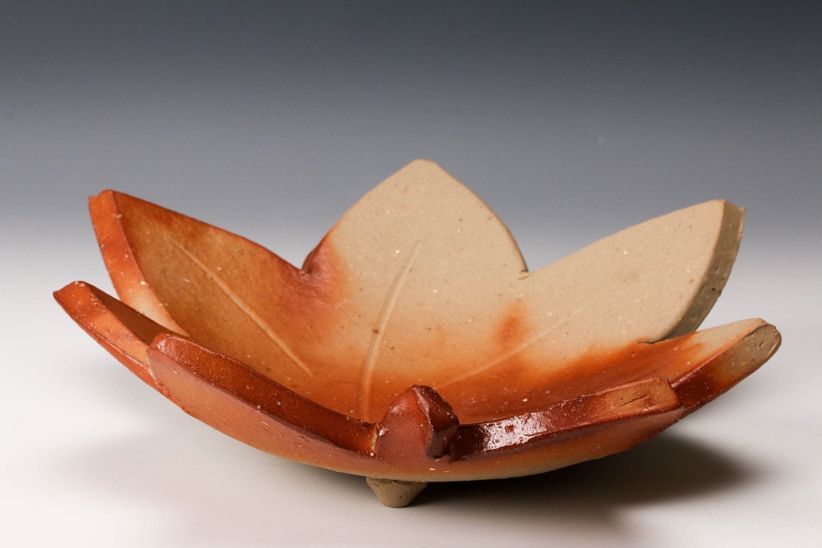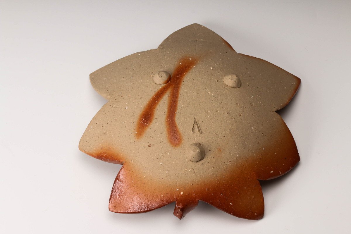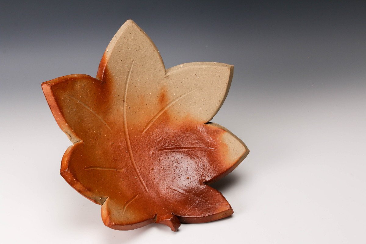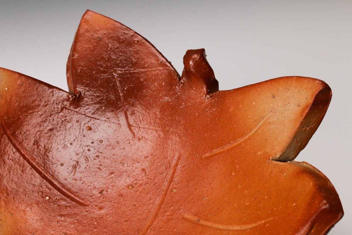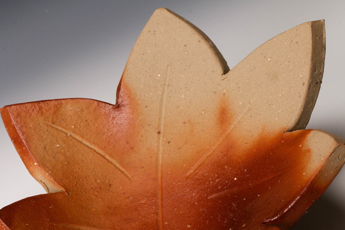 【佳香】人間国宝 伊勢崎淳 備前緋襷もみじ皿 共箱 共布 栞 本物保証