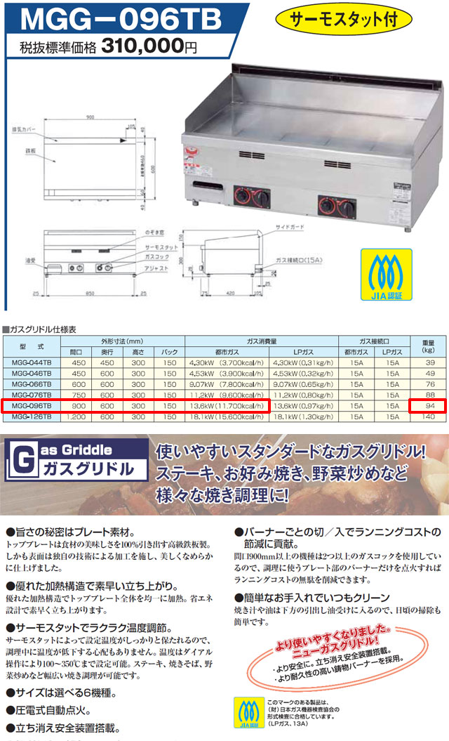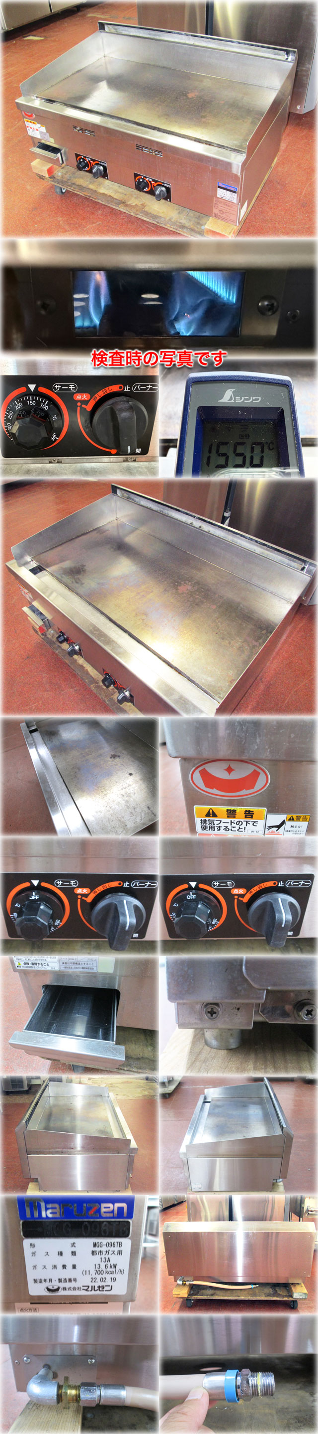 マルゼン 卓上ガスグリドル MGG-096TB を出品いたします。 ■特徴■ 使いやすいスタンダードなガスグリドル! ステーキ、お好み焼き、野菜炒めなど 様々な焼き調理に! 旨さの秘密はプレート素材。 トッププレートは食材の美味しさを 100%引き出す高級鉄板製。 しかも表面は独自の技術による加工を施し、 美しくなめらかに仕上げました。 優れた加熱構造で素早い立ち上がり。 優れた加熱構造でトッププレート全体を均一に加熱。 省エネ設計で素早く立ち上がります。 サーモスタットでラクラク温度調節。 サーモスタットによって設定温度がしっかりと保たれるので、 調理中に温度が低下する心配もありません。 温度はダイアル操作により100~350℃まで設定可能。 ステーキ、焼きそば、野菜炒めなど 幅広い焼き調理が可能です。 圧電式自動点火。 立ち消え安全装置搭載。 バーナーごとの切/入でランニングコストの節減に貢献。 間口900mm以上の機種は 2つ以上のガスコックを使用しているので、 調理に使うプレート部のバーナーだけを点火すれば ランニングコストの無駄を削減できます。 簡単なお手入れでいつもクリーン 焼き汁や油は下方の引出し油受けに入るので、 日頃の掃除も簡単です。 ■仕様■