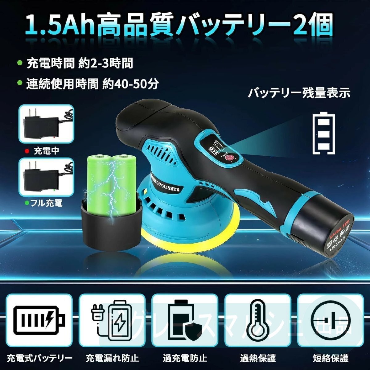 ◆【コードレスで軽量★豊富な付属品★幅広い用途】 ダブルアクションポリッシャーは、コードレス軽量で強力なパワーを備えた小型充電式研磨機です。電源コードを接続することなく使用できます。バッテリーを含めて重さはわずか1.2 kgで、腕が疲れにくく、初心者だけでなく、女性や高齢者の方にも最適です。カーポリッシャーには豊富なアクセサリが付属しており、さまざまなシーンや異なる素材の表面のケア、磨き、研磨を可能にし、追加のアクセサリー購入の必要がなく、1台のポリッシャーで多様なニーズを満たすことができます。ダブルアクションポリッシャーなので、シングルアクションに比べ傷やムラになりにくく高性能です。自動車のワックスや磨きだけでなく、家具の研磨、風呂場の掃除、大理石の磨き、物の元の光沢を復元し、金属製品の錆取りなど幅広い用途が可能です。
