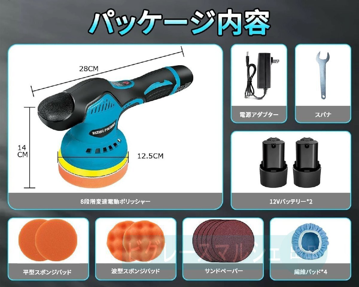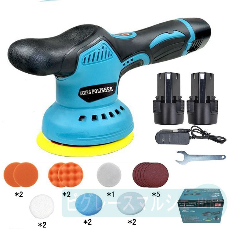◇付属品:本体+充電器+ツール+バッテリー* 2 +フラット研磨ディスク* 2 +ウェーブ研磨ディスク* 2 +模造ウール研磨ディスク* 1 +模造ウールカバー* 2 +ブルーファイバーカバー* 2 +ホワイトファイバーカバー* 2 +サンドペーパーディスク* 5