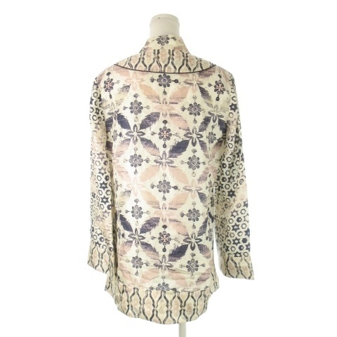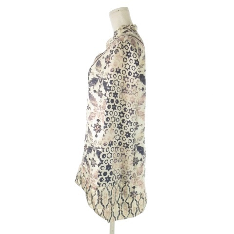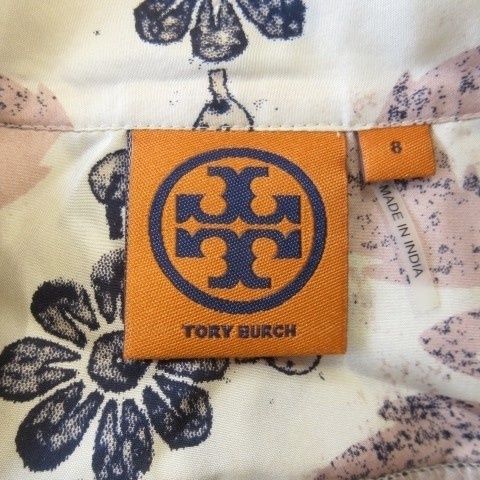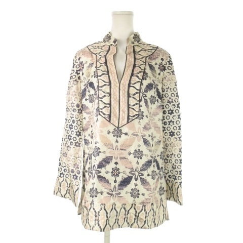 トリーバーチ TORY BURCH ブラウス チュニック 絹 シルク 8 L 白 ホワイト アイボリー 紺 ネイビー キーネック 花柄 幾何学模様