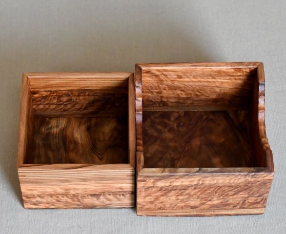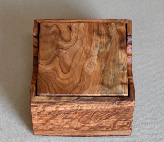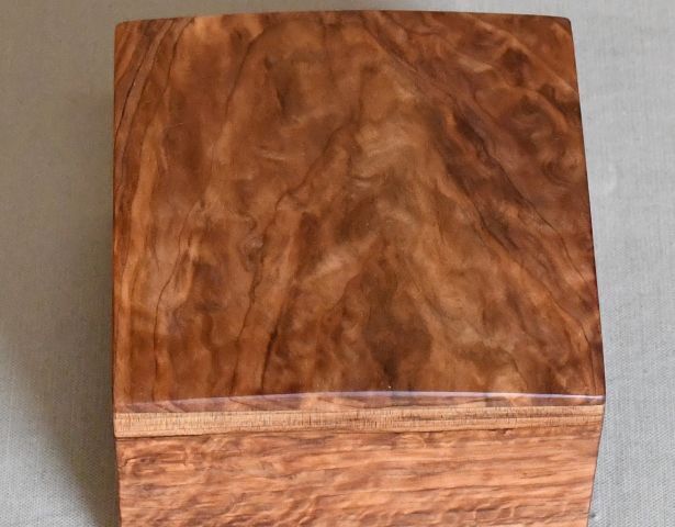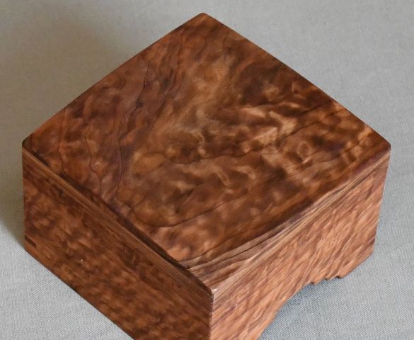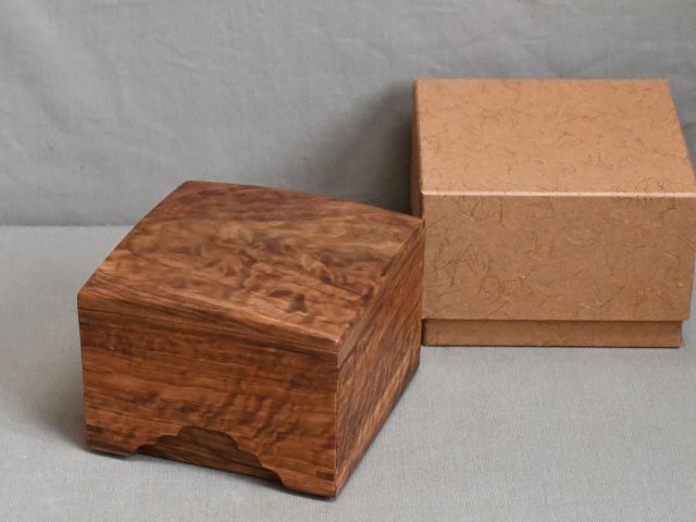 | 徳島県産木頭杉瘤上杢の駒箱、四隅落し。新品。化粧箱付き | ||