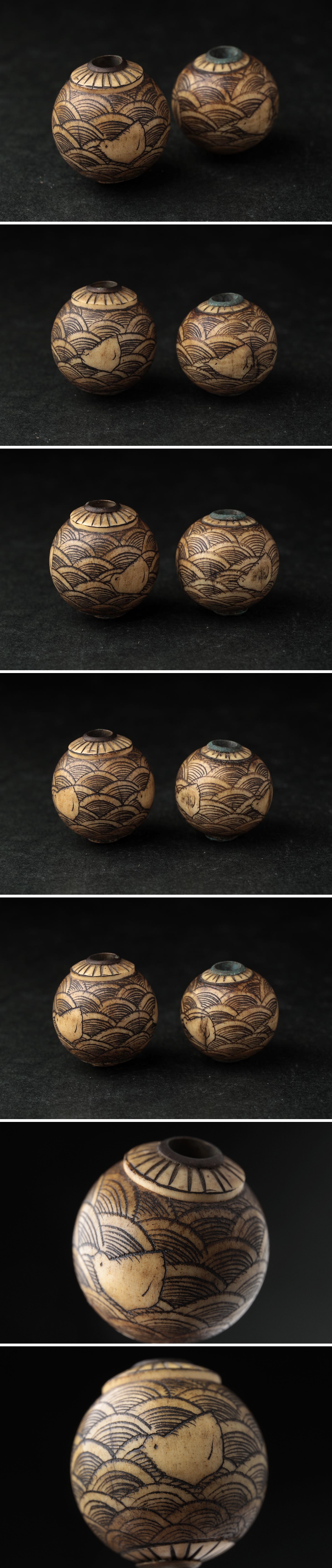 | ◆ 時代提げ物 古骨彫 波千鳥図緒締・青海波千鳥彫図緒締玉 二点・古根付 提物 印籠 煙草入 装飾具 装身具 古美術 ◆
