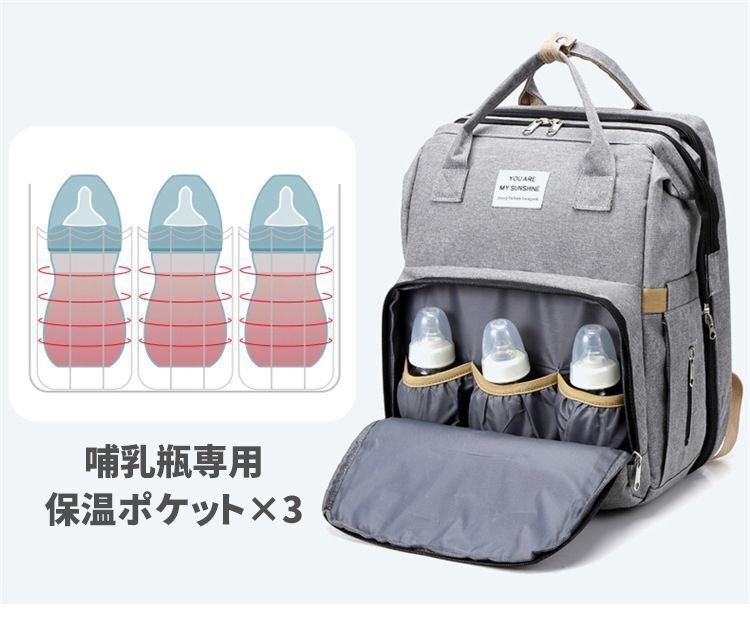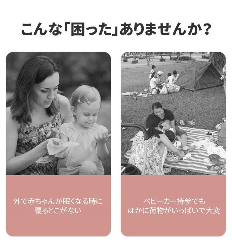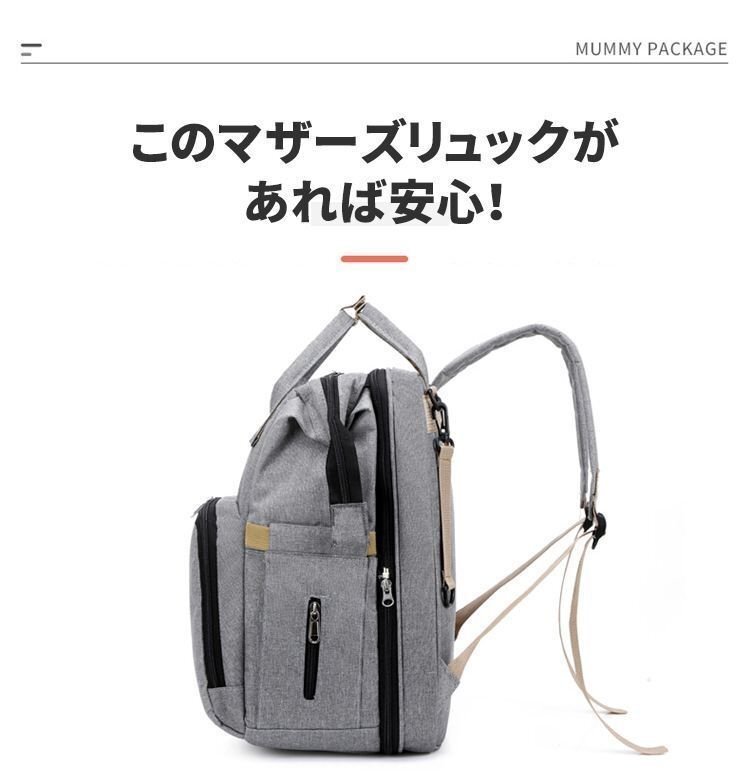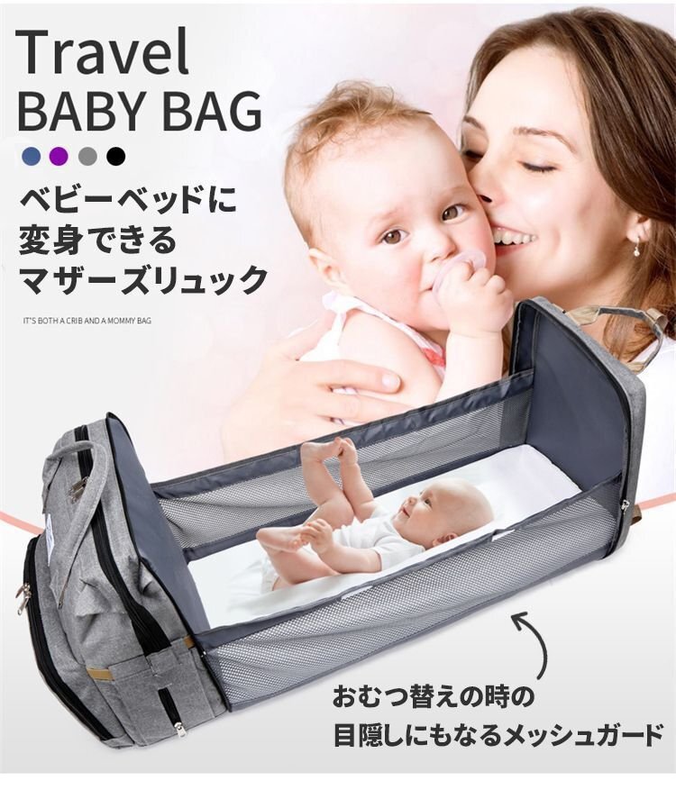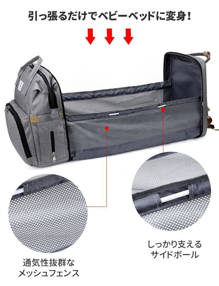 【サイズ】(約)40cm×30cm×20cm 【重 量】(約)0.86kg 【素 材】防水オクスフォードクロス 【POINT】 パッと見は普通のリュックなのに、開くとベビーベッドに大変身! ママの「欲しい」に応えたマザーズバッグ。 軽量で携帯性に優れたベビーベッド内蔵のリュック。 限られたスペースで赤ちゃんを寝かすことができるので、旅行中や帰省シーンで大活躍。 おむつ交換のスペースがない場所にも、安心してお出掛けできちゃう。 【ご注意】 ※商品の写真はできる限り実物のお色に近づけるように加工しておりますが、お使いのモニター設定、お部屋の照明などにより、実際の商品と異なる場合がございます。 ※商品や個体差などにより、表記と若干異なる場合がございますが、予めご了承くださいませ。 ※輸入品のため、糸の継ぎ目や縫製等が甘い部分、糊跡等が生じる場合がございますが、予めご了承くださいませ。 ※生地の特性上、やや匂いが強く感じられるものもございます。数日のご使用や陰干しなどで気になる匂いはほとんど感じられなくなります。 ※配送の方法によっては、商品に多少のシワ等ができる場合がございますが、出来る限りお客様にリーズナブルな価格帯でご提供するためです。ご了承くださいませ。 ※採寸方法の違いにより、多少の誤差がある場合がございます。