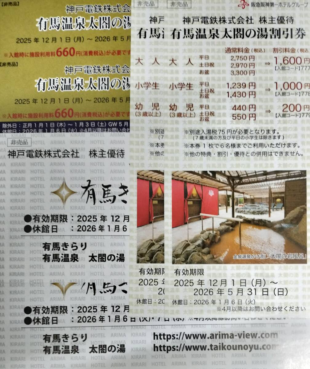 神戸電鉄 株主優待券 有馬温泉太閤の湯 優待券 割引券 有馬きらり宿泊割引券 各2枚
