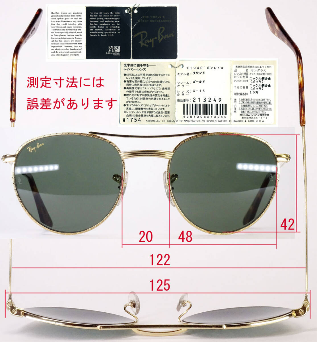 ●両レンズのサイドに‘BL’印が入って、右レンズの上部に‘Ray Ban’の印字、