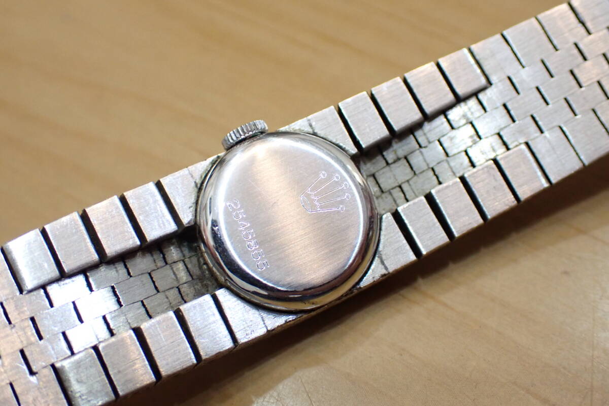 ロレックス/ROLEX プレシジョン 18K刻印 2166/Cal.1400 ワンピースブレスレット 手巻きアンティークレディース腕時計です。 古いロレックスのプレシジョンです。 ケースと一体の美しいブレスレットが特徴です。 裏蓋にはホールマークやK18の刻印などがあります。 ブレスレットのバックルにもK18・Wのようなマーク?の刻印があり、細かいスレや汚れ等あります。 全体の重さは約50gです。 ガラスはおおむね綺麗です。 ゼンマイを巻いて、数分程度の確認ですがカチカチと動いています。 ブレスレット等の正確な金の品位や詳細は不明です。 オーバーホール前提で、ジャンク扱いでお願いします。 ケース径:約15mm 腕回り約17cm ・他にいろいろ出品しています。 同封可能です。 !オークション終了後、24時間以内に「お取引を始める」ボタンをクリックして、必ず取引をスタートして下さい。 取引のスタートが無ければ、削除させていただきます。 必ず厳守してください! 「新規ID」「直近で悪い評価が多い方」のトラブル(イタズラなど)が非常に多いです。 当方が、お取引に支障があると判断したID(特に新規ID)は削除します。 ●ジャンク品と記載の物の商品到着時の動作保証はありません。 ●付属品等は、写真に写っているものですべてです。 | ||||