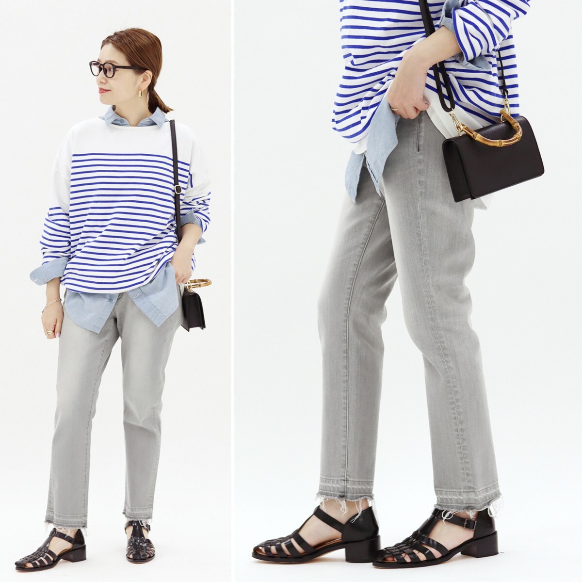 ポリウレタン混で程よくストレッチが効いています。肌触りも柔らかく、ストレスフリーな履き心地を実現。馴染みの良い素材なので、ぴったりで履きたい方は普段よりワンサイズ下を選んでみるのも◎《すっきり見えるストレートシルエット》大人の女性にピッタリな綺麗見えするストレート型。足首に少しゆとりが出て、スッキリと見せてくれます。ウエストのサイズ感を微調整し、よりストレスなく履ける仕上がりに。フラットなシューズでもバランス良く合わせ易い適度な着丈も◎《こなれ感がで出るデザイン》さり気ない裾の切りっぱなしデザインがアクセントに。カジュアルなカットソーにはもちろん、レースやフリル付きの綺麗目ブラウスとも相性抜群。グレーは少し色あせたような風合いがお洒落です。
