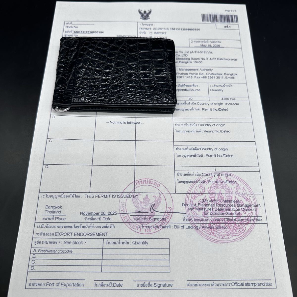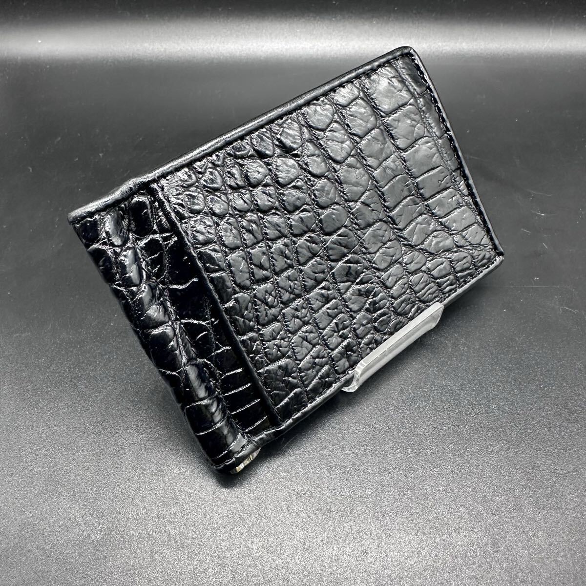 ハンドメイド により海外工房で制作された、二つ折りマネークリップ (ワニ革)の出品になります。