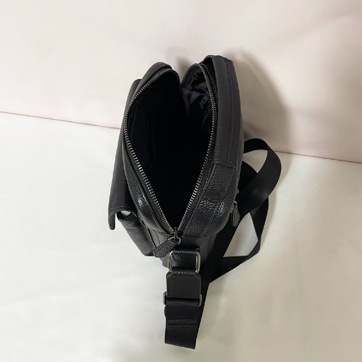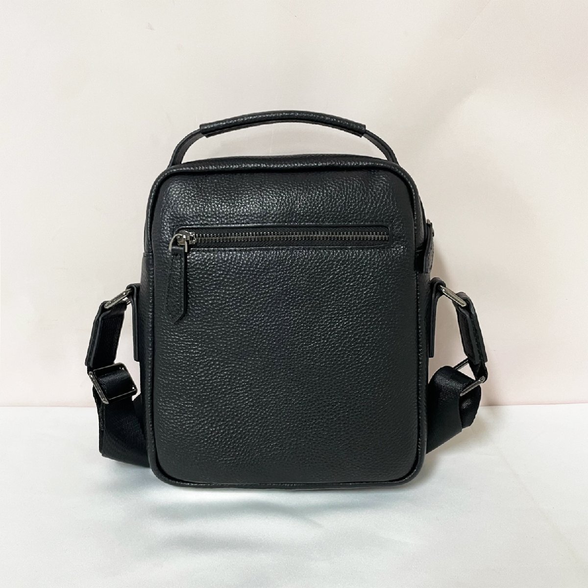 定番のブラック色使いにすることで、機能性だけでなく細かなデザインにもこだわっております。開閉口はファスナーにより大事な物の紛失を防止します。コンパクトなレザーバッグですが、内側にはファスナーポケットなども装備され、収納力がけっこうあります。スマホ、鍵などいつも持ち歩く身の回りの物をすっぽり入ります。また、ショルダーベルト付きますので、ハンドバッグとしてもショルダーバッグとしても気分に合わせて2wayでお使いいただけます。