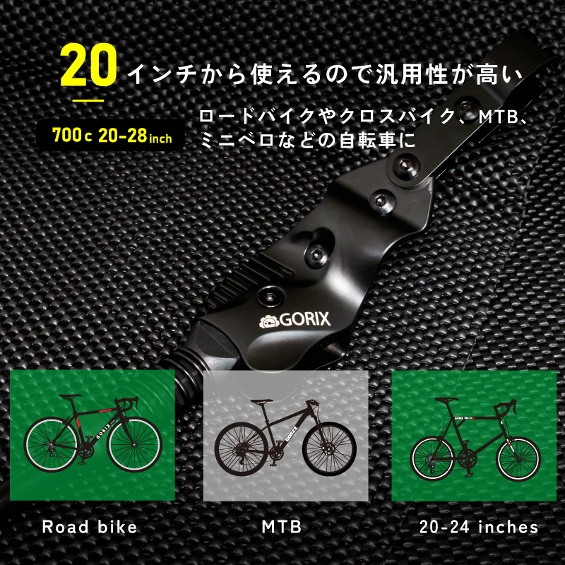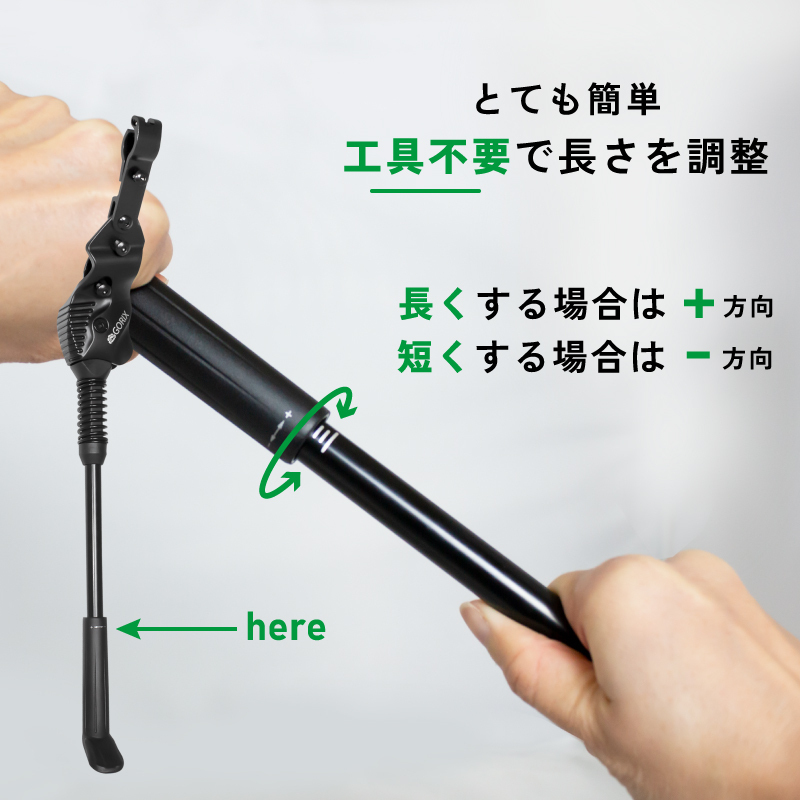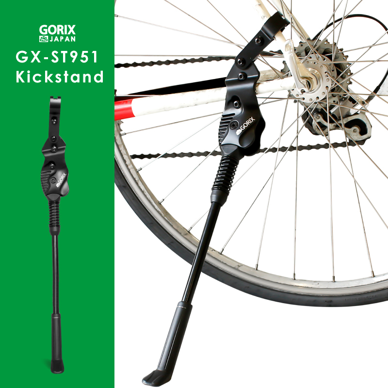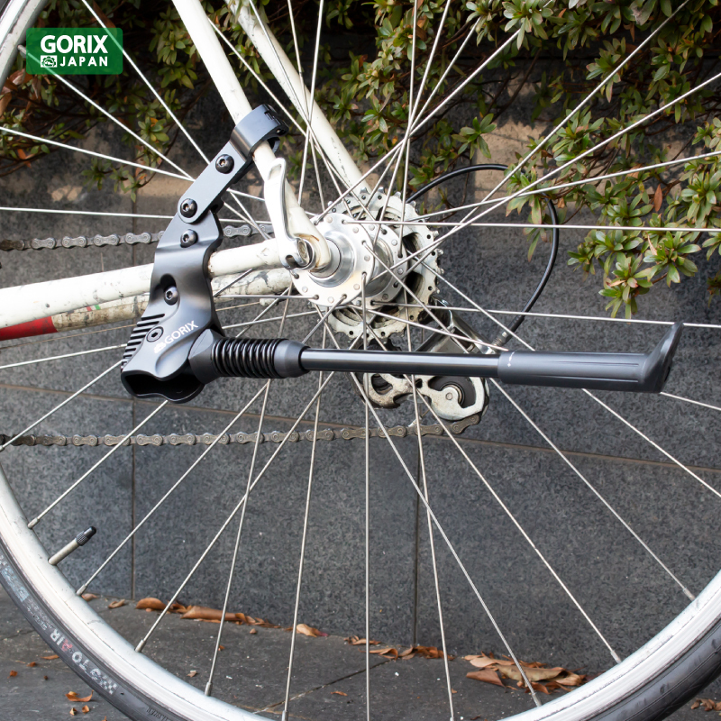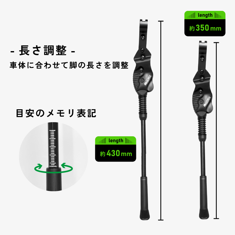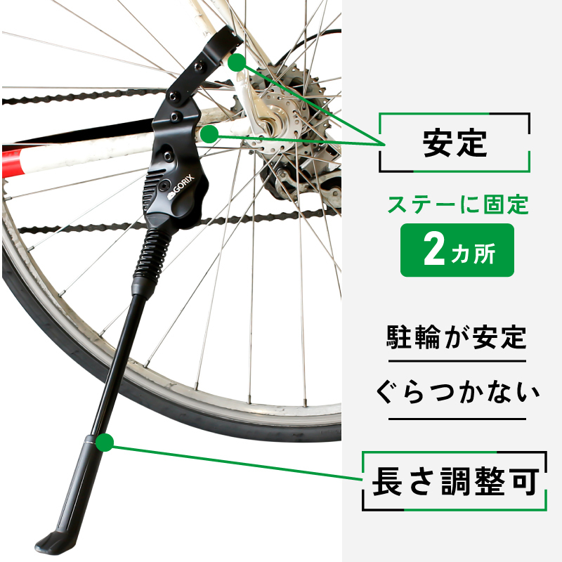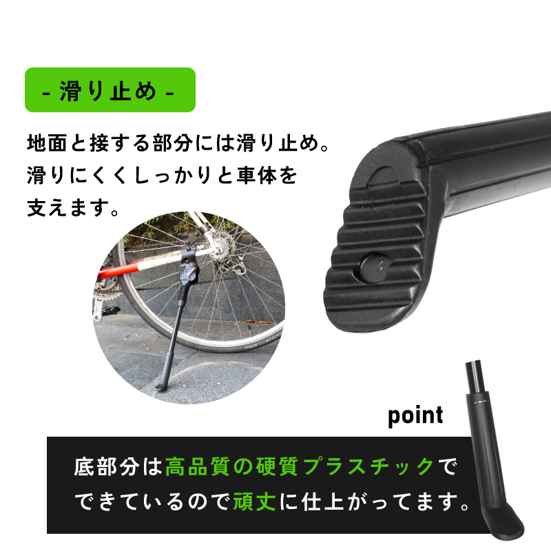 サイドスタンドが無く駐輪に困っている方に最適です。 車体取付の自転車用キックスタンド。 20-28インチ700cに対応していて柔軟に調整できるのでロードバイクやクロスバイク、mtb、ミニベロなどの幅広く自転車に装着できます。 チェーンステーとシートステーに固定するのでぐらつかずしっかりと安定します。 アルミ合金素材なので軽量。 脚の長さ調節も工具不要で簡単におこなえます。 [20-28対応] 長さ調整ができので幅広い自転車に対応します。 約35cmから43cmまで調整できます。 ロードバイクから小径車まで。 [滑り止め] 地面と接する箇所には滑り止め加工を施しており滑りにくい。 [安定] ステー2点止めで固定するので車体がぶらつかずしっかりと安定します。 商品内容自転車用キックスタンド 全長約35-43cm 調節可能範囲約5cm 重量約360g 対応20-28インチ700c 材質アルミ合金 ・商品は入荷によりキズがある場合があります。 その場合、保証対象外になりますのでご了承お願い致します。 ・ディスプレイ環境により実物と色が異なる場合が有ります。 ・入荷時期により予告無く一部仕様変更する場合が有ります。 | |