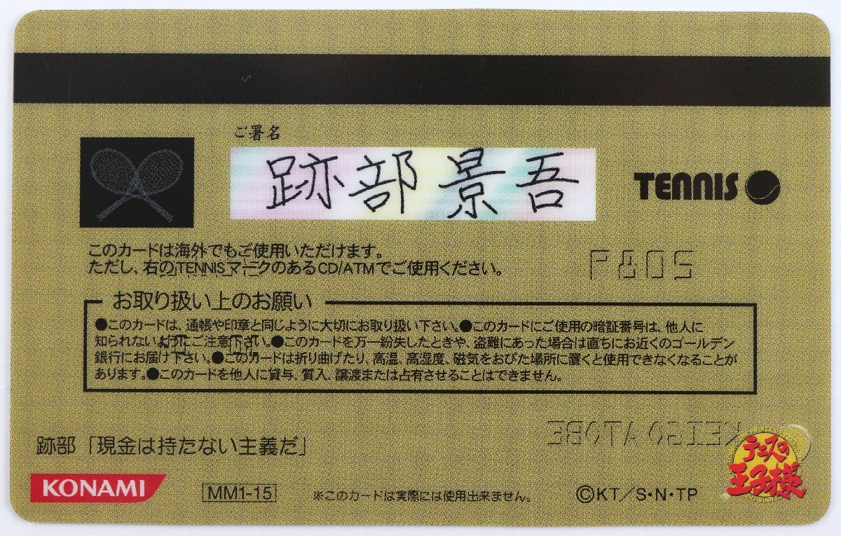 (1050386K) ◆中古品です。 カード テニスの王子様 『MIX&MATCH CARD 跡部景吾』 メーカー:KONAMI/コナミ ゴールデンカード 氷帝学園中等部 生徒会会長 ◆付属品 付属品はありません。 ※商品写真に掲載したものが全てです。 ◆外観 目立ったキズ・ヨゴレ等はありません。 | ||||
