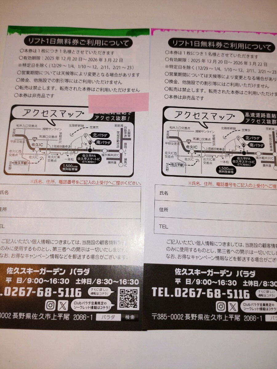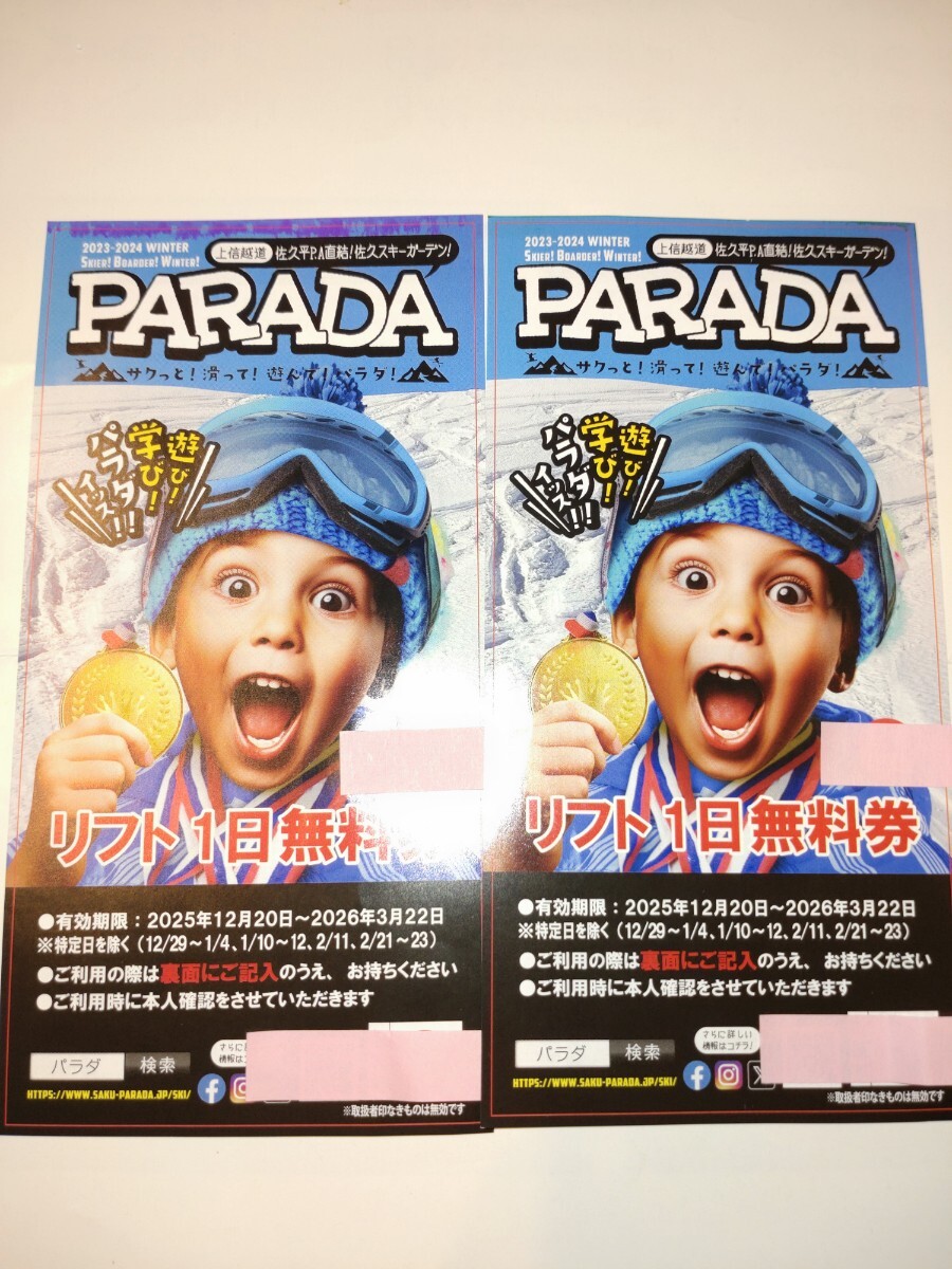 商品名 : 佐久スキーガーデンパラダ リフト1日無料券2枚セット