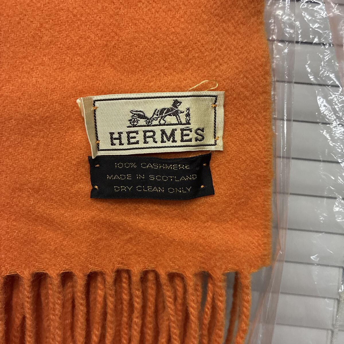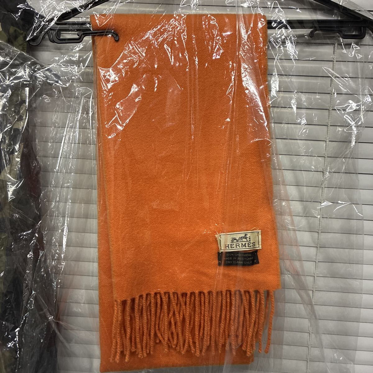 数年保管のHERMESカシミヤ100%マフラーです、幅40cm長さ166cm(素人採寸です、誤差ご了承下さい)です、毛玉や破れ等のダメージは有りません、クリーニング出しての出品ですので、そのままご使用いただけます、喫煙無し、ペットも飼っておりません。実物は画像より落ち着いたオレンジです。