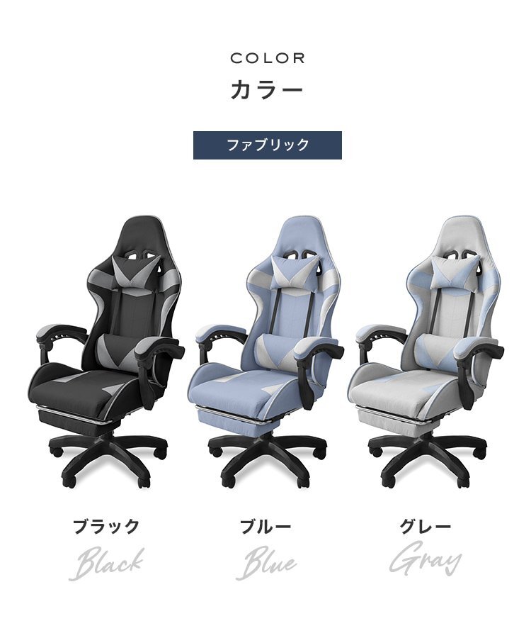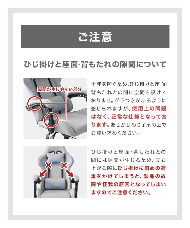 一番人気の王道ゲーミングチェア ■120度リクライニング付 最大120度まで倒せるリクライニング!! レバーを倒すだけでスムーズに簡単に倒すことができます。 ■座面高さ調整 手前のレバーを引くと座面の高さを調節することができます 最大で約10cmまで高くすることができます ■フットレストでリラックス♪ 必要な時だけ取り出せるフットレスト スライドレール収納式なので、片手で簡単に引き出せます。 リクライニングを最後まで倒した状態で使うと足を延ばすことができ、 よりリラックスできます ■通気性に優れるファブリック生地♪ ムレにくいので、長時間座っていてもサラッと快適に過ごせます。 カジュアルな雰囲気でお部屋に馴染みやすい! 【商品仕様】 カラー:グレー サイズ : ・本体(約)幅62×奥行60×高さ115-125cm ・重量:(約)13kg ・ 耐荷重:(約)100kg 【注意事項】 ※お客様組立の商品です。 ※組立て方や商品の個体差により、サイズは若干差異が生じる場合がございます。予めご了承下さい。 ※使用環境によりキャスターの潤滑具合が悪くなることがあります。ご了承下さい。 ※商品は、モニターによって色合いが異なって見える場合があります。 ※仕様・デザインは改良のため予告なく変更することがあります。 保証期間 7日間 ※使用開始時期や使用期間に関わらず、お買い上げ日から7日間です。 商品到着後から7日を過ぎますと、交換の際の往復送料はお客様負担となりますのでご了承ください。 場合によっては対応出来ないケースもございます。 |