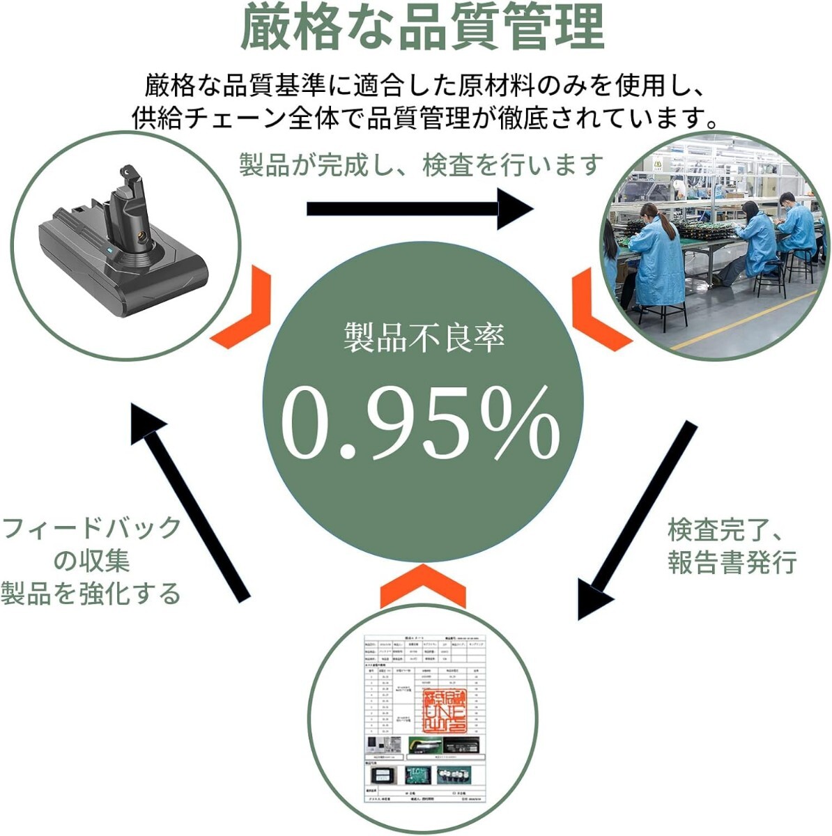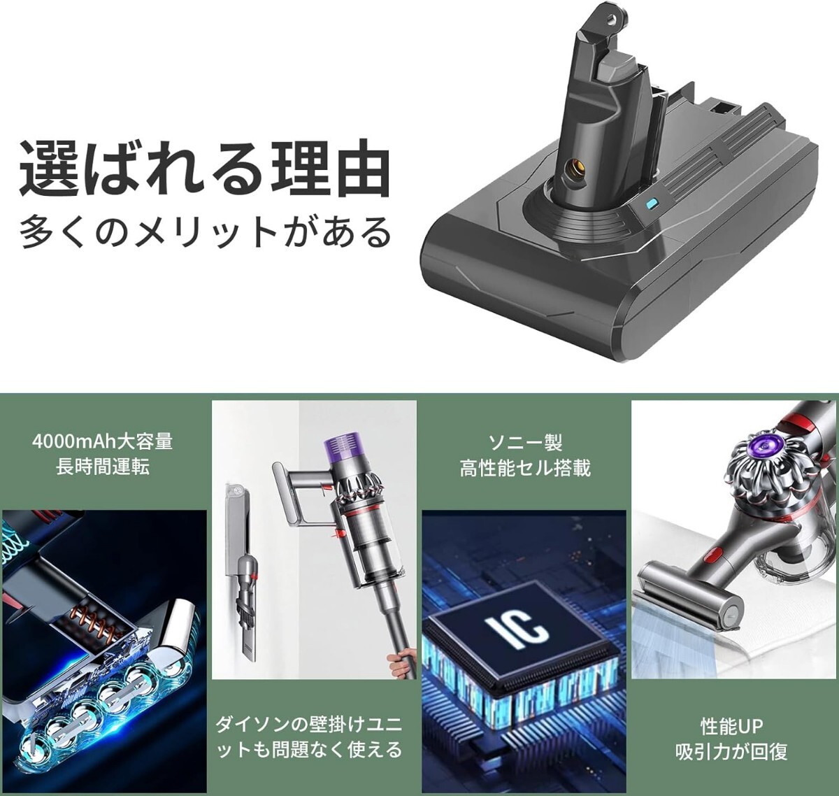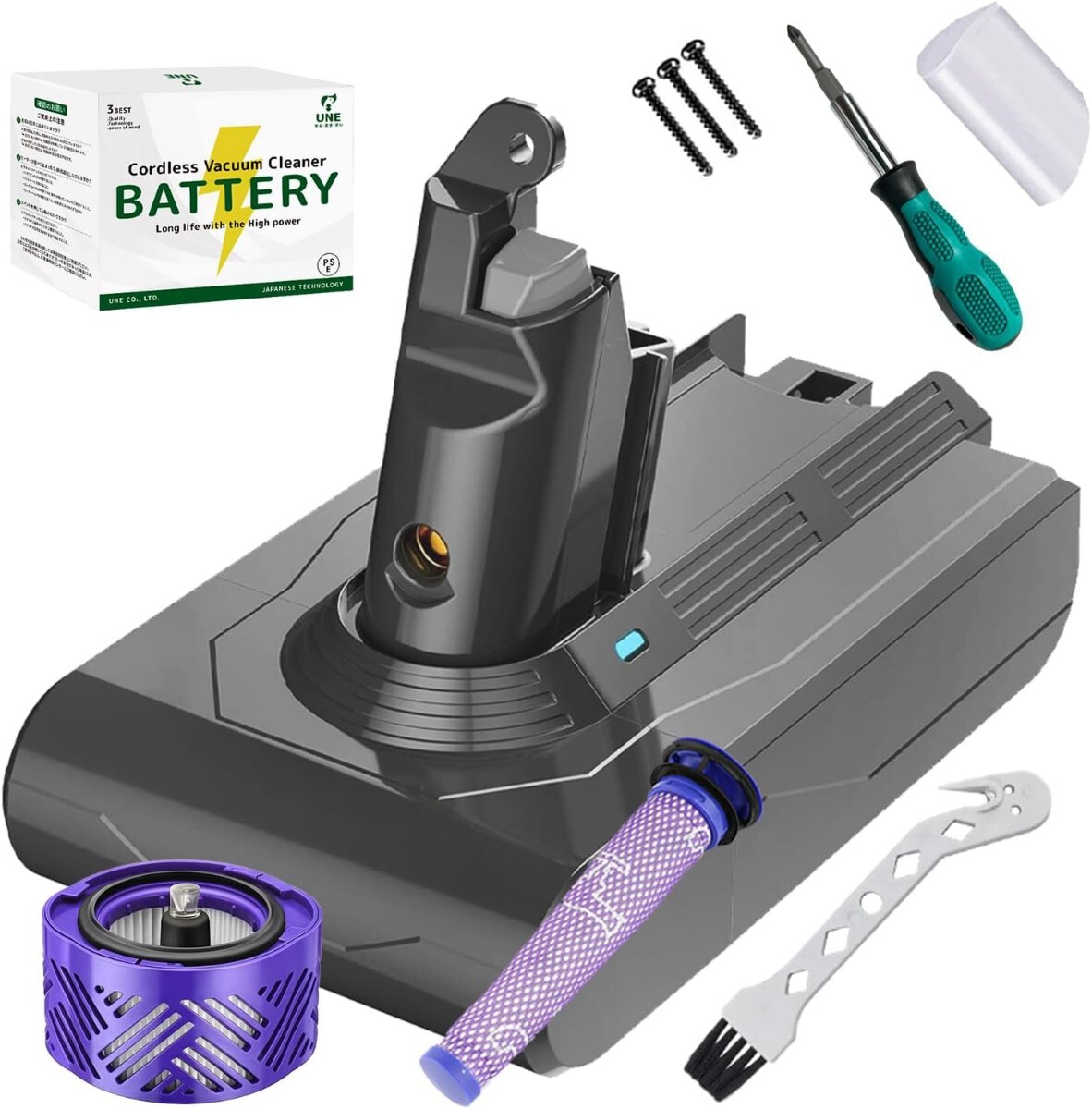 【V6シリーズ対応の互換バッテリー】対応機種:V6シリーズ [V6(=SV07,SV08,SV09,HH08), DC61, DC62, DC74 motorhead, DC74 motorhead complete, DC74 Fluffy, V6 trigger, V6 mattress, V6 mattress+, V6 motorhead, V6 motorhead+, V6 trigger+, V6 trigger pro, V6 Car+Boat, V6 Car+Boat Extra, V6 slim, V6 Baby+Child, V6 Top Dog, V6 Fluffy(SV09MH), V6 Fluffy+(SV09MHCOM), V6 Fluffypro, V6 Animalpro(SV08MHCOM)] 容量:4000mAh。サイズ:7.3CM*12.2CM*9CM 弊社のバッテリーのサイズは純正と完全に同じです。発売記念として、今ならプレフィルター、ポストフィルター、メンテナンスブラシをプレゼントしておりますのでこの機会にいかがでしょうか。