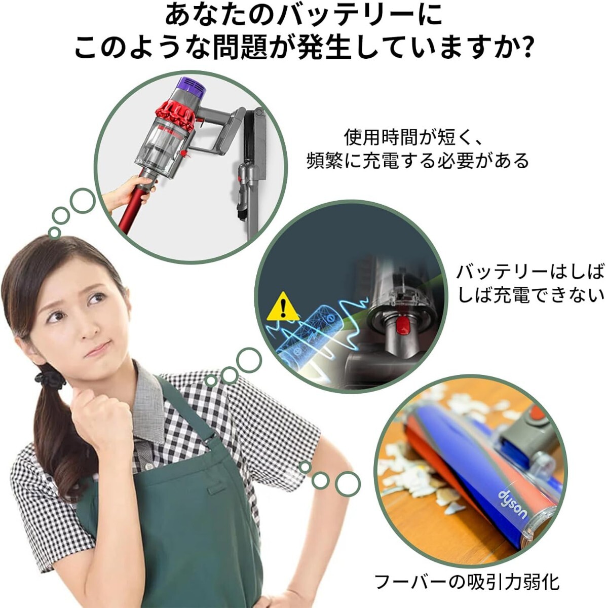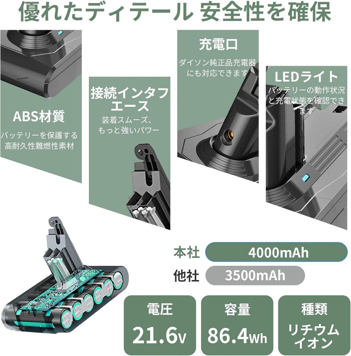 【大容量V6交換用バッテリー】バッテリー容量4000mAhで長い連続稼働時間を実現しております。掃除機に大容量のYewruck交換用バッテリーを使用する利点には、清掃時間の延長、効率の向上、高強度作業への適応、充電時間の減少、吸引力の強化、そしてユーザー体験の向上が含まれます。これらの利点により、大容量の交換用バッテリーは、高効率な清掃を求めるユーザーにとって理想的な選択となります。より大容量のバッテリーは便利で効率的であり、ユーザー体験を大幅に向上させることができます。ユーザーはバッテリー切れの心配をすることなく、清掃作業に集中でき、快適な清掃体験を楽しむことができます。このような便利さと信頼性は、掃除機に対するユーザーの満足度を高めるでしょう。