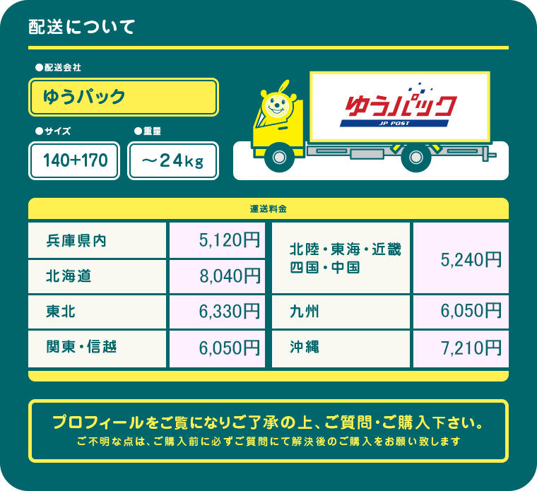 兵庫県より[ゆうパック140+170サイズの2個口]にて発送します。