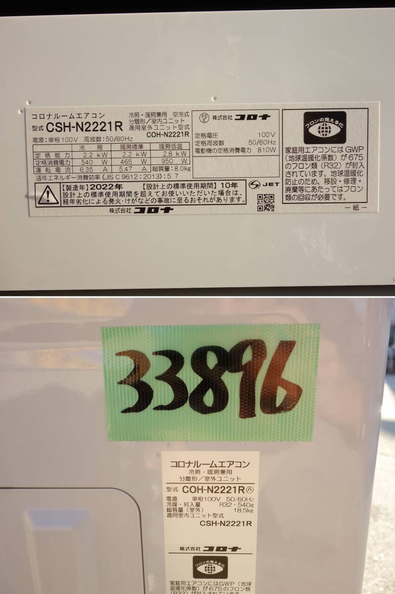 【中古】K▼即決 コロナ ルームエアコン 2022年 2.2kw ~8畳 冷暖房兼用 標準モデル コンパクトタイプ ReLaLa CSH-N2221R (33896)