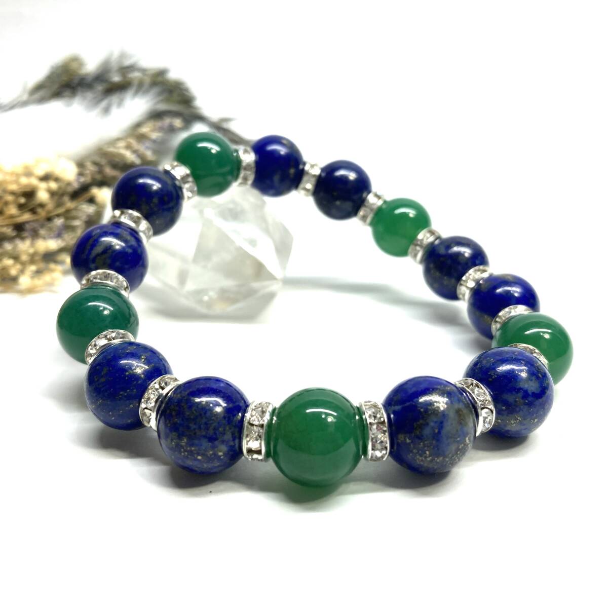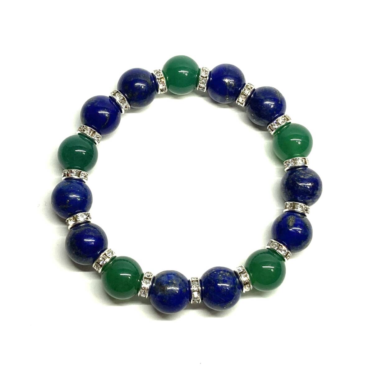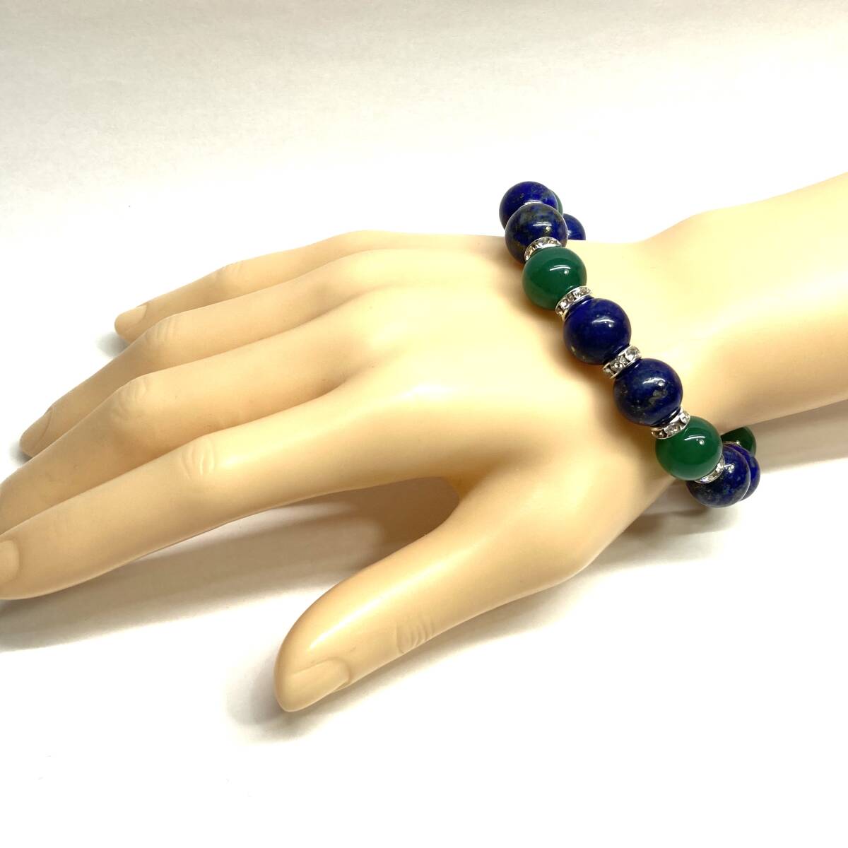 こちらは、ラピスラズリと緑瑪瑙を組み合わせたパワーストーンブレスレットです。間にはロンデルを挟み高級感あるデザインに仕上げております。程よくインパクトがある12mm玉を使用して内周約18cmです。(サイズ変更の場合は取引ナビにてご連絡をお願いします。) 数に限りがございますので気になる方はお早めにどうぞ。