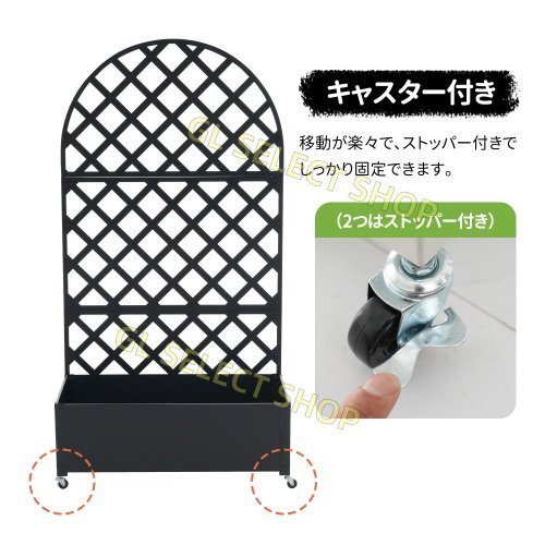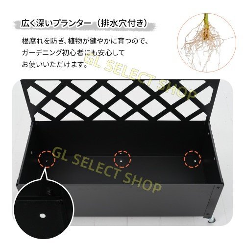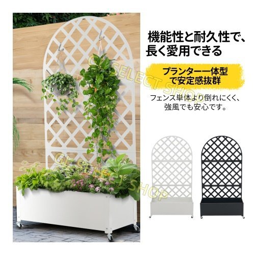 • ◎04 機能性と耐久性で、長く愛用できるプランター一体型で安定感抜群:フェンス単体より倒れにくく、強風でも安心です。高品質金具:接続部分がしっかり固定され、サビに強く、長持ちします。底部にスペースあり:花箱の底部に隙間があり、掃除がしやすく、清潔に保つことができます。地面まで7cm キャスター付き(2つはストッパー付き):移動が楽々で、ストッパー付きでしっかり固定できます。電着塗装:電着塗装による防錆加工が施されており、錆びにくく、屋外でも安心してご使用いただけます。簡単設置 (約15分)簡単組み立て:誰でも手軽に組み立て可能です。