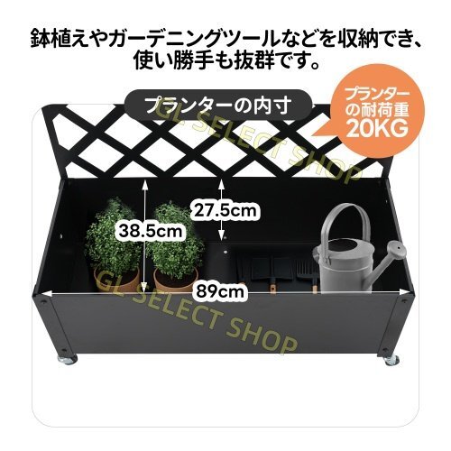 • ◎03 植物と調和したナチュラルな景観作り つる性植物に最適:グリーンカーテンや花でフェンスを彩れば、季節ごとに変化するオリジナルの風景が楽しめます。フェンス耐荷重 20KG 広く深いプランター(排水穴付き):根腐れを防ぎ、植物が健やかに育つので、ガーデニング初心者にも安心してお使いいただけます。鉢植えやガーデニングツールなどを収納でき、使い勝手も抜群です。プランターの内寸:89*38.5*27.5cm プランターの耐荷重:20KGS