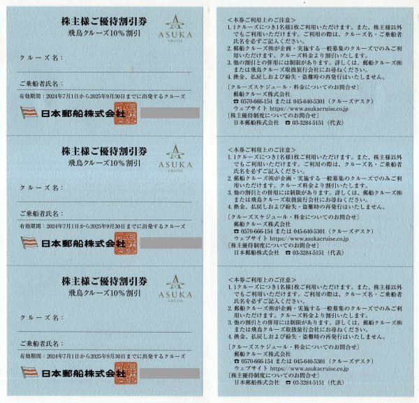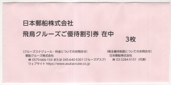 ★ 日本郵船 株主優待割引券 飛鳥クルーズ10%割引 3枚 有効期限2025年9月30日 氷川丸ご招待券 2枚 有効期間2025年6月30日 ★