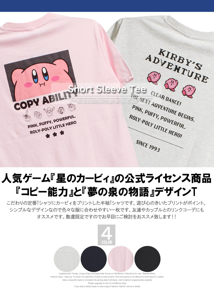 | 商品説明 | こだわりの定番Tシャツにカービィをプリントした半袖Tシャツです。 |