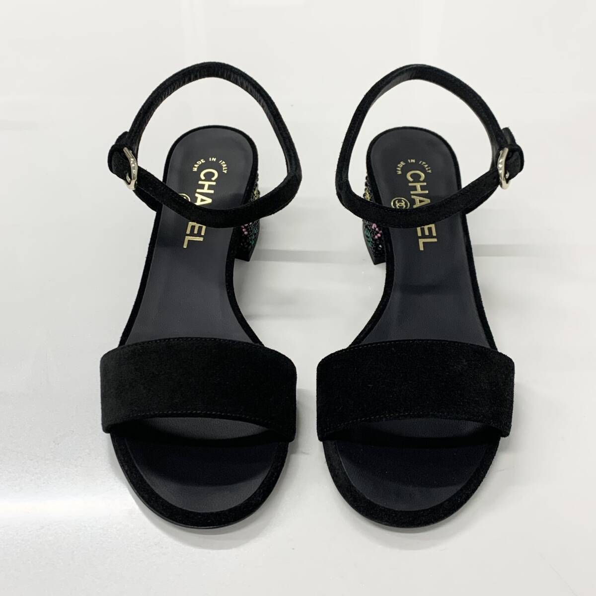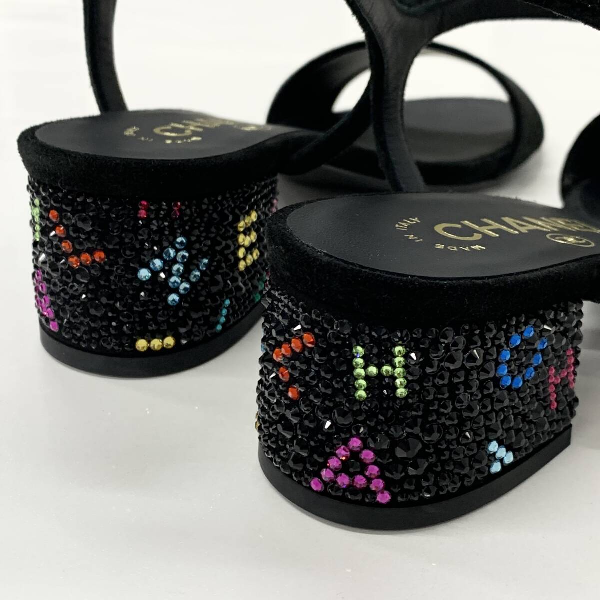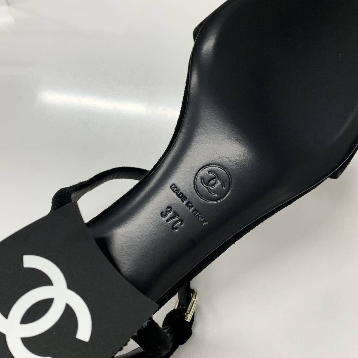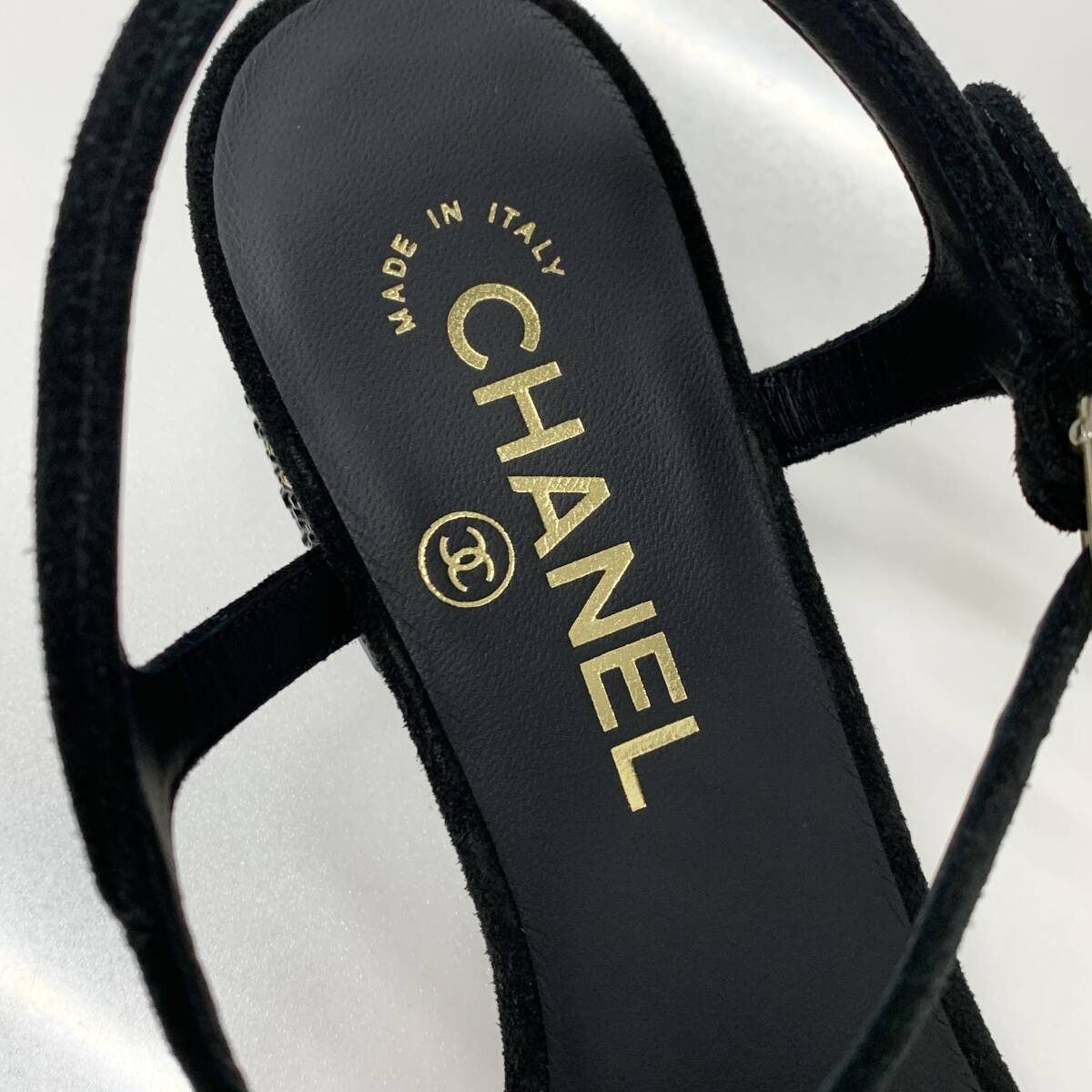 未使用 シャネル ココマーク ラインストーン スエード ストラップ サンダル ブラック
