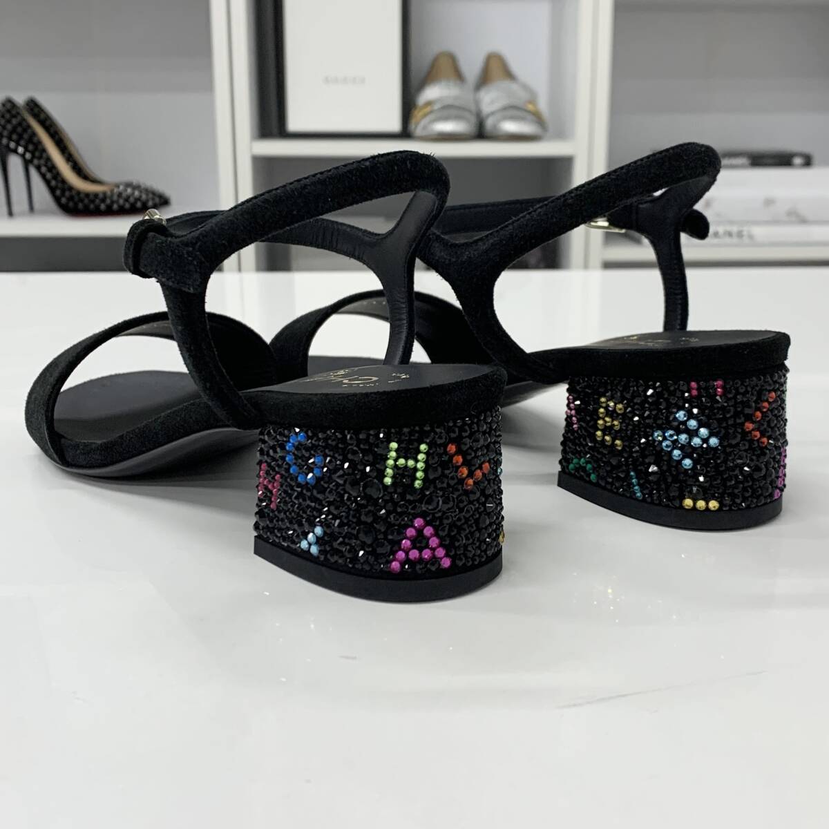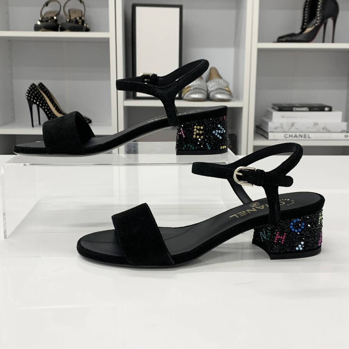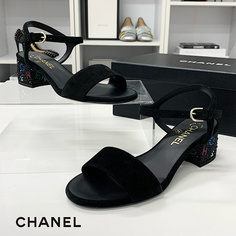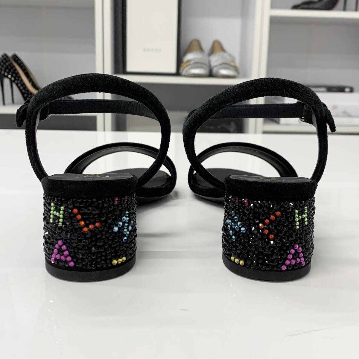 未使用 シャネル ココマーク ラインストーン スエード ストラップ サンダル ブラック