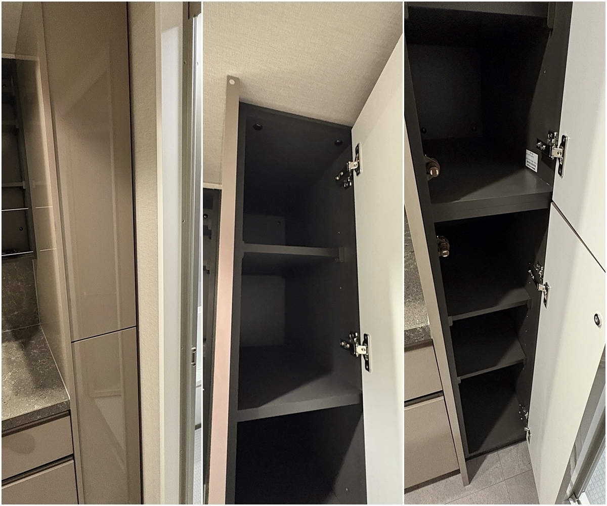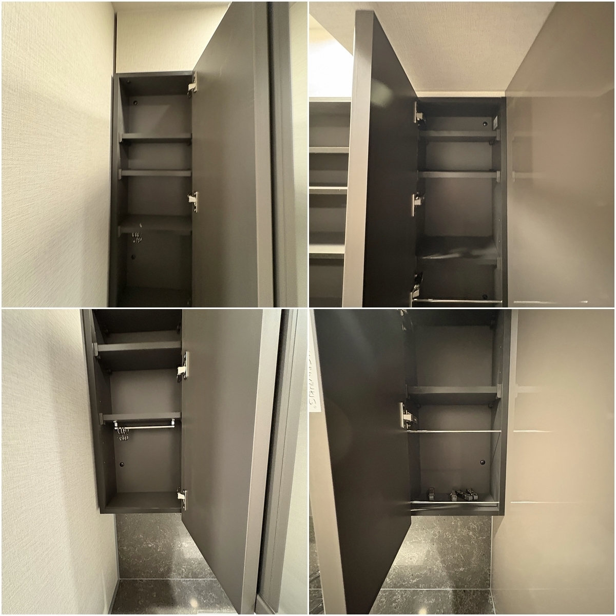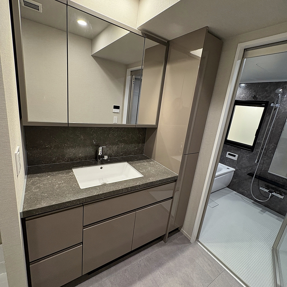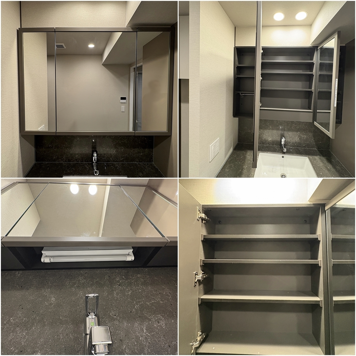 ★収納力抜群の三面鏡ミラーキャビネットと周辺収納トールユニット付き