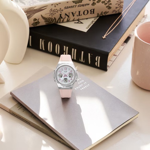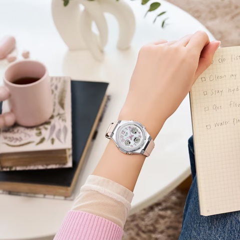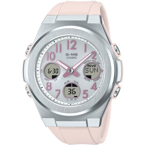 アクティブで洗練された女性に向けたBABY-G G-MSから、視認性の良いアラビック数字をインデックスに取りれた上品で着けやすいニュアンスカラーのモデルです。