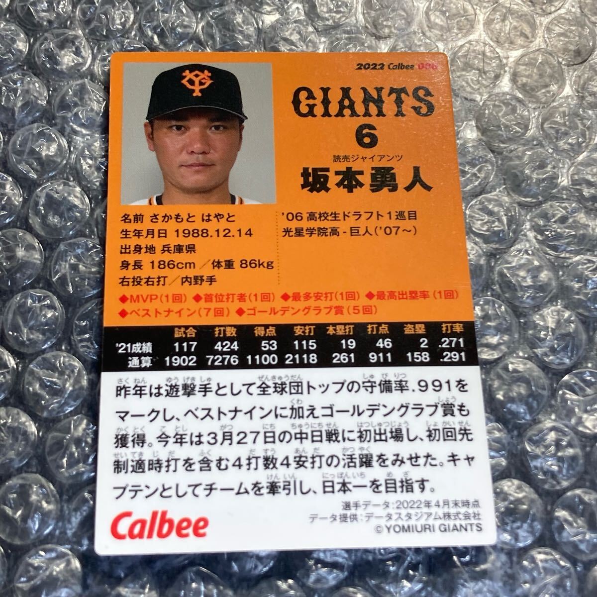 カルビープロ野球チップスカード2022 読売ジャイアンツ 坂本勇人です。