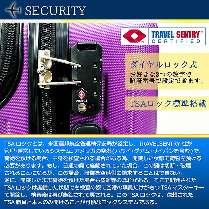 ■TSAロック標準搭載で安心の米国旅行。