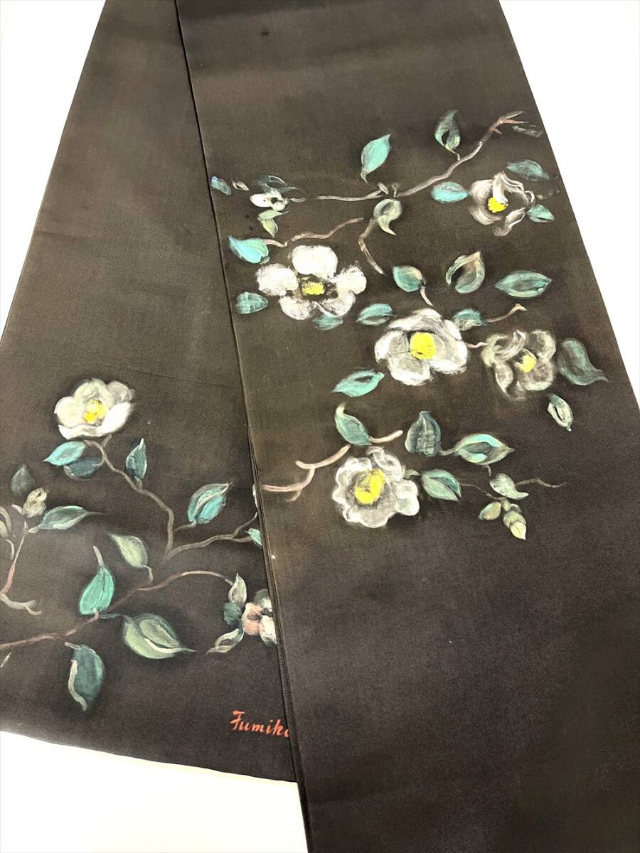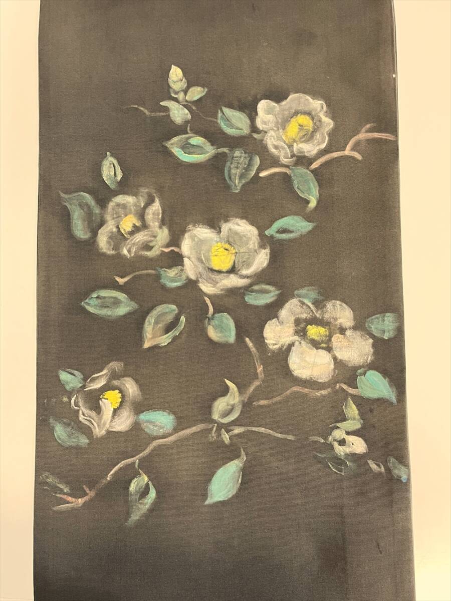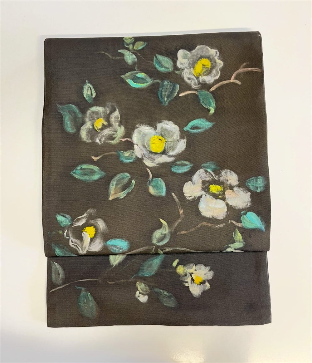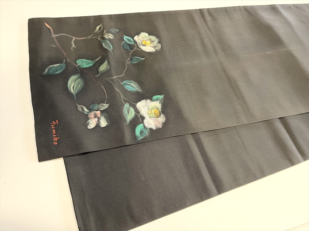 花とら●リサイクル帯 袋帯 灰黒 灰茶 地描き 椿     250505