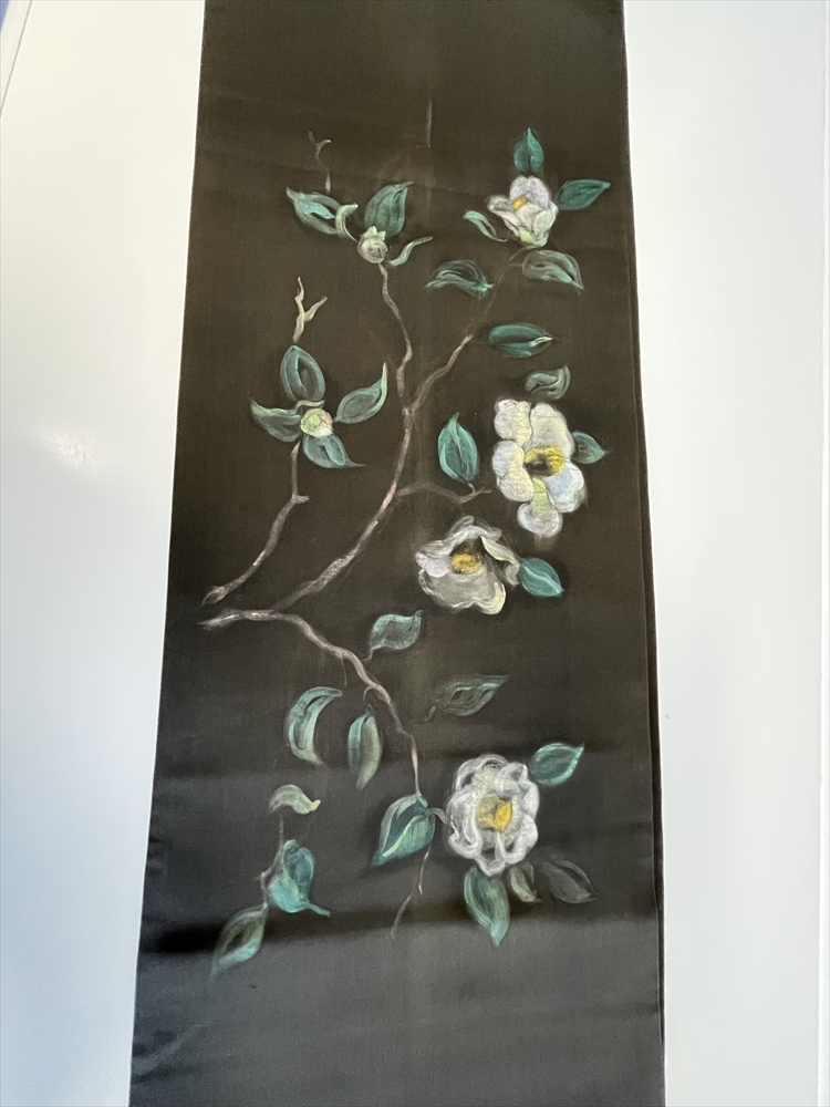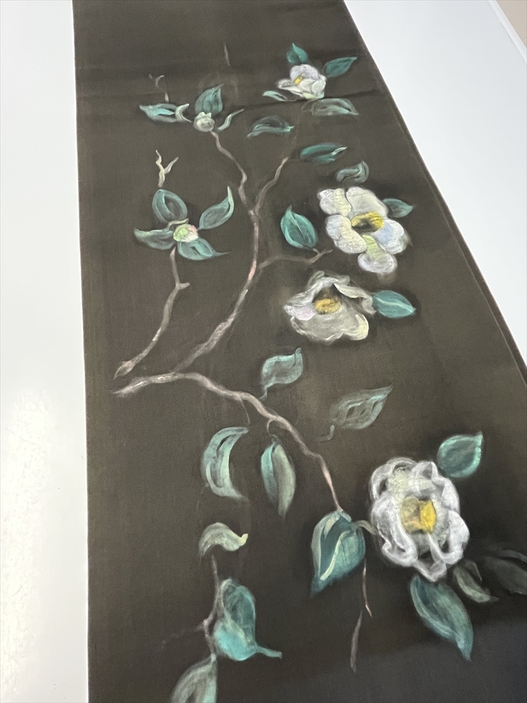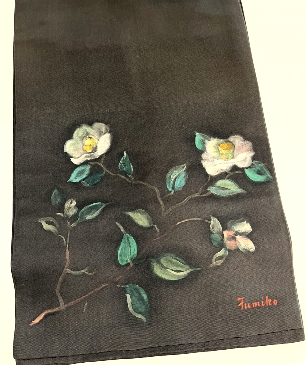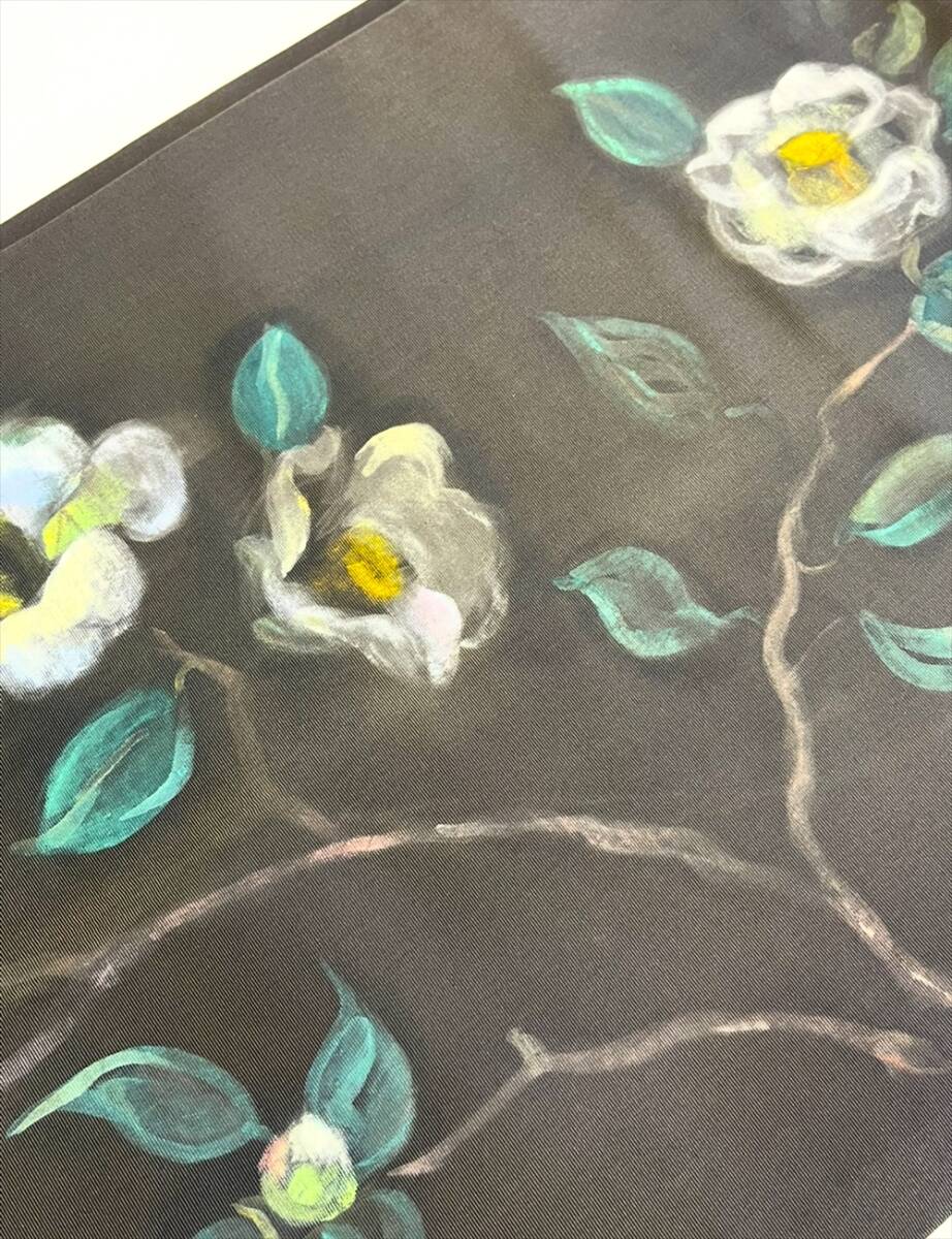 花とら●リサイクル帯 袋帯 灰黒 灰茶 地描き 椿     250505