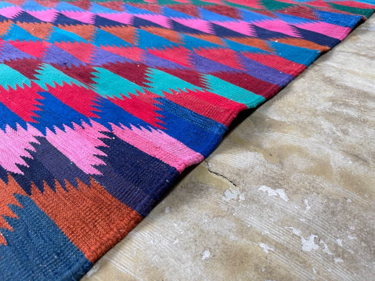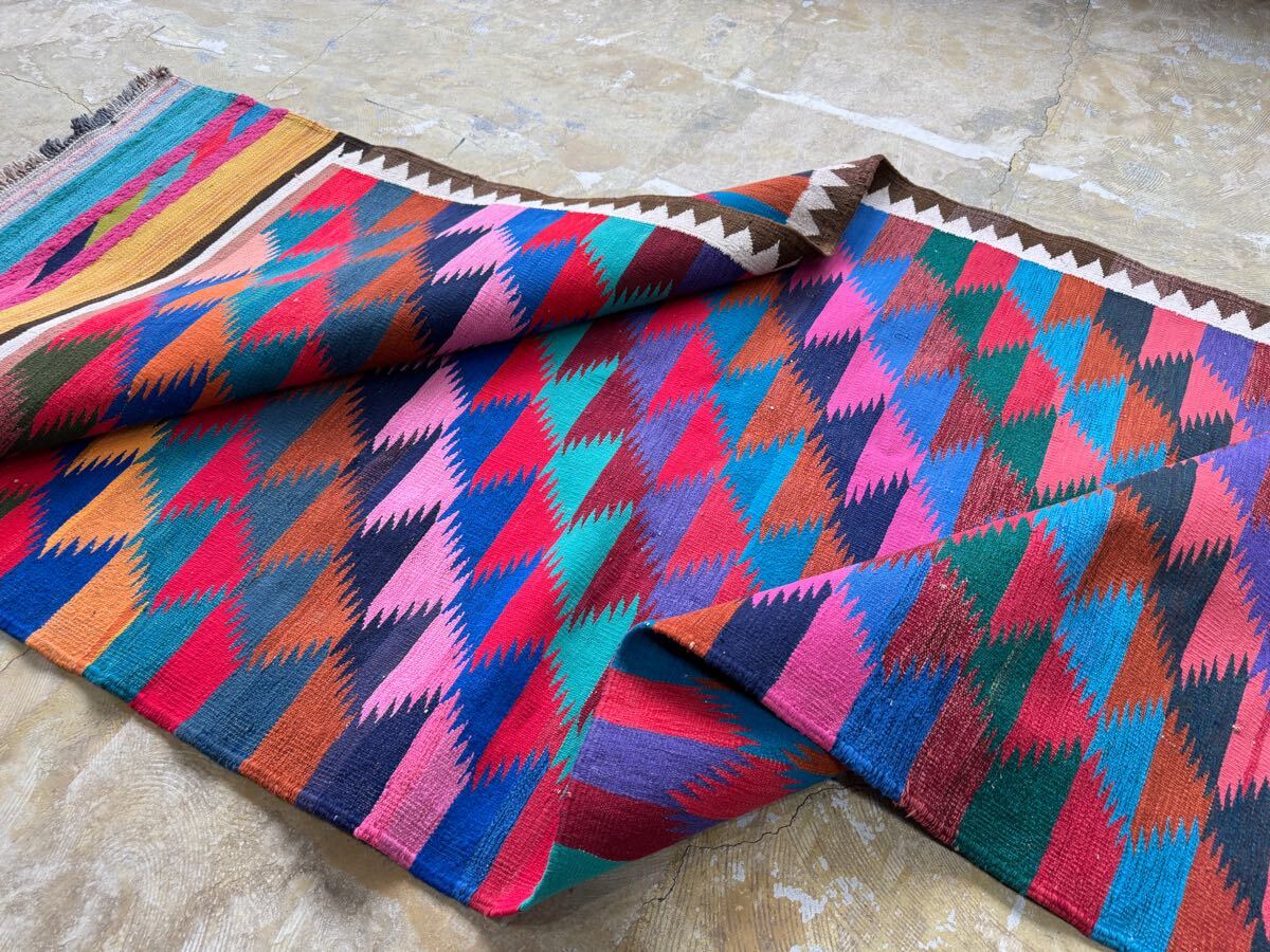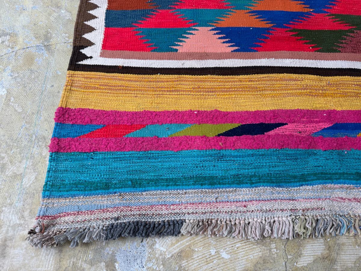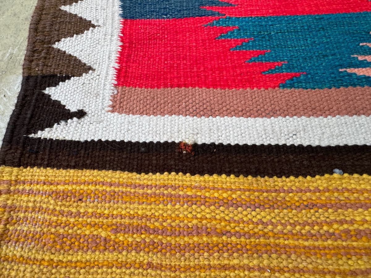 左右に軽い波打ち、左下にほつれが見られますが、ヴィンテージラグの味としてお楽しみください。写真をご確認ください。