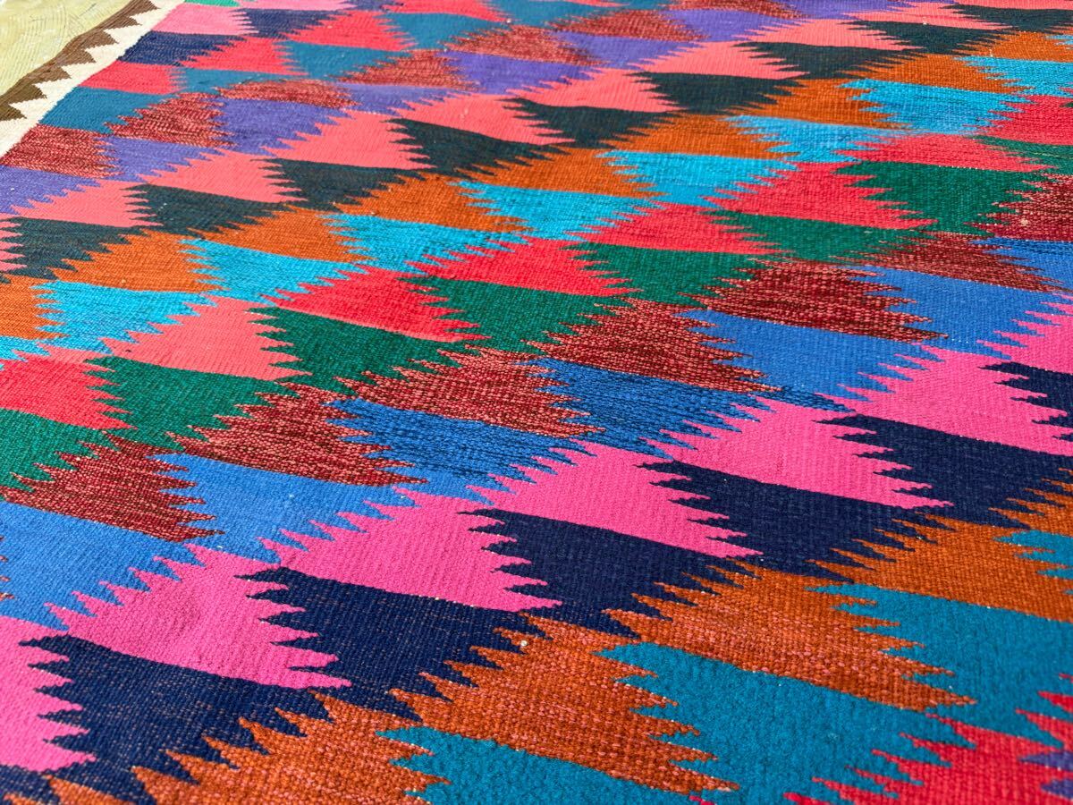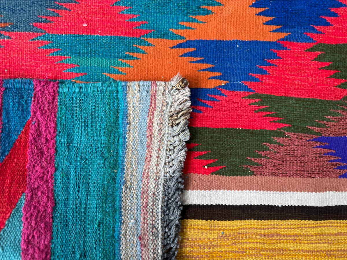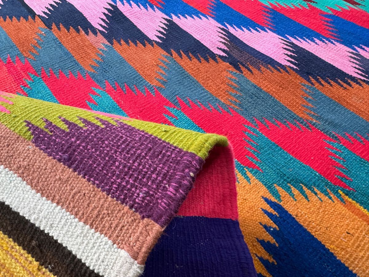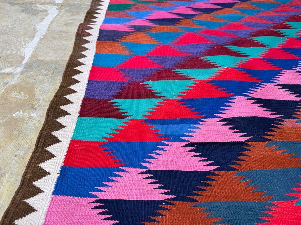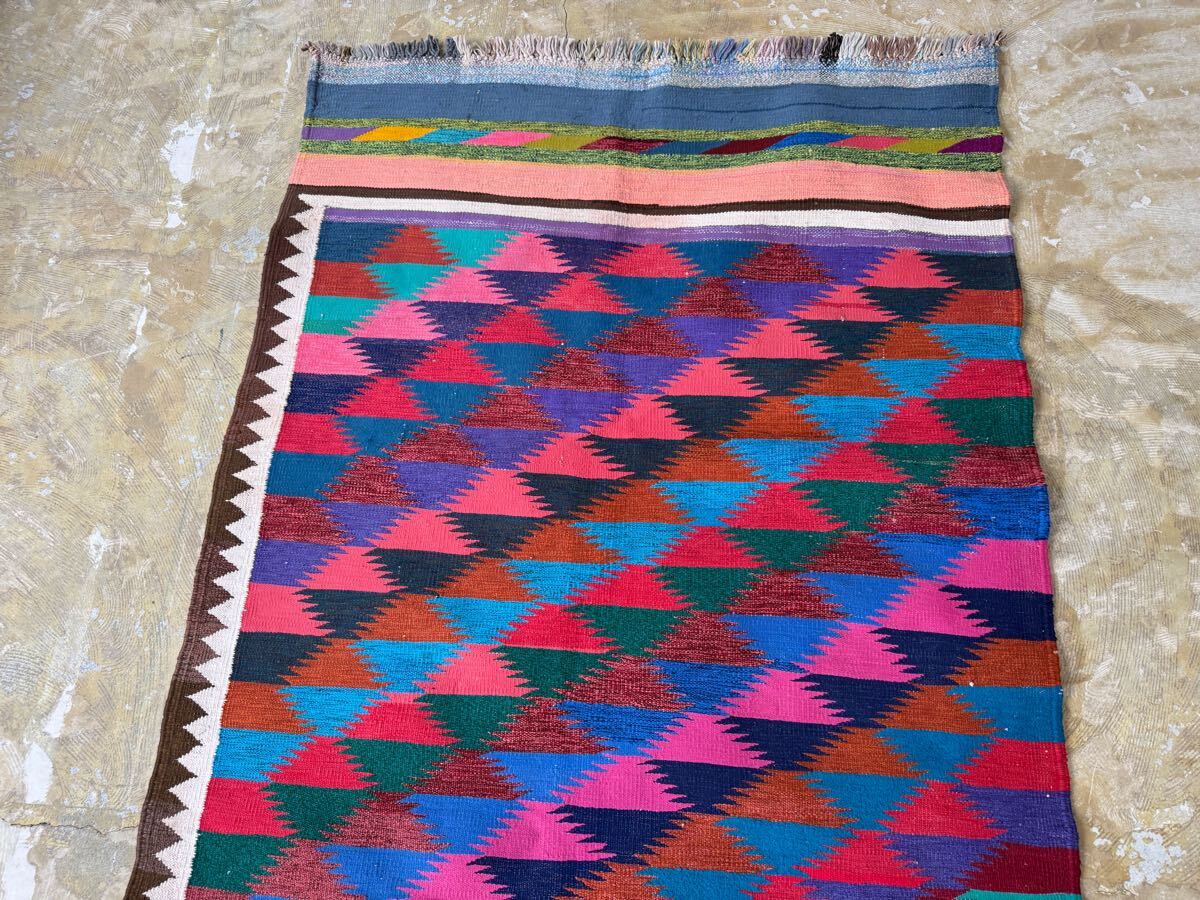 左右に軽い波打ち、左下にほつれが見られますが、ヴィンテージラグの味としてお楽しみください。写真をご確認ください。