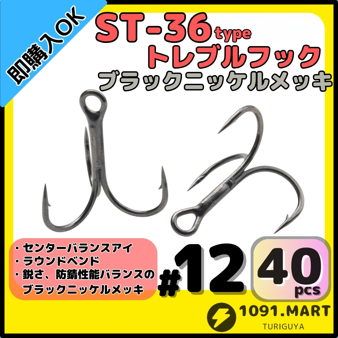 【送料無料】ST-36タイプ防錆トレブルフック ブラック#12 40本セット 高品質ルアーフック ラウンドベンド ソルト対応トリプルフック 釣り針