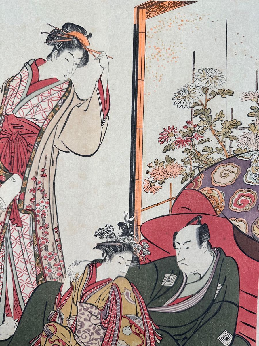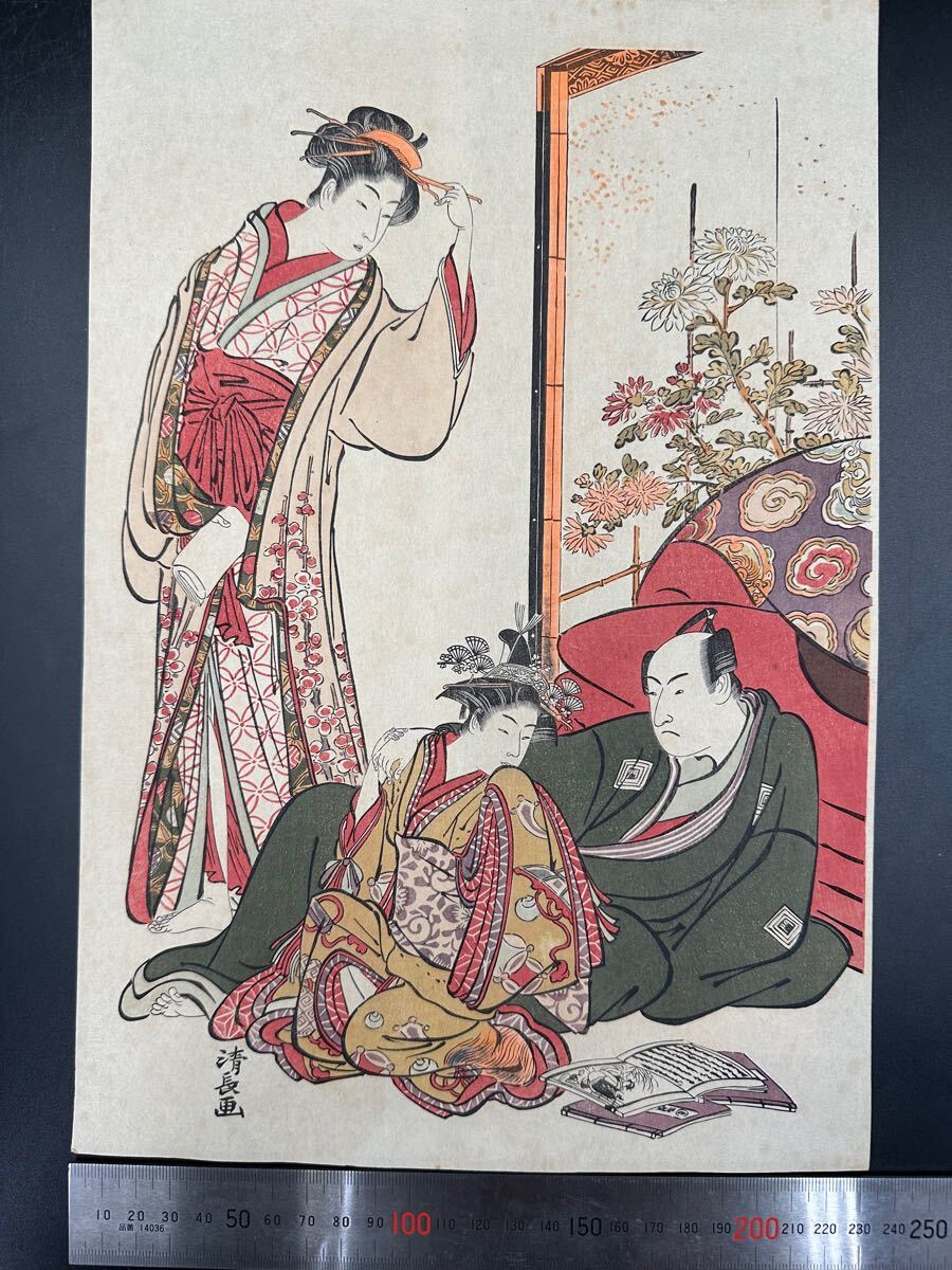【真作】大正期 浮世絵木版画 鳥居清長 「市川門之助と美人」美人画 大判 錦絵 保存良い