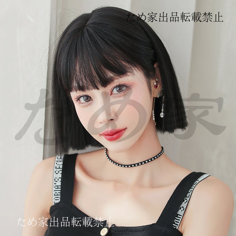 新品人毛 ショートボブウィッグ セミロングストレート 自然なブラック つむじ部分手植え 自然に見えますフルウィッグ