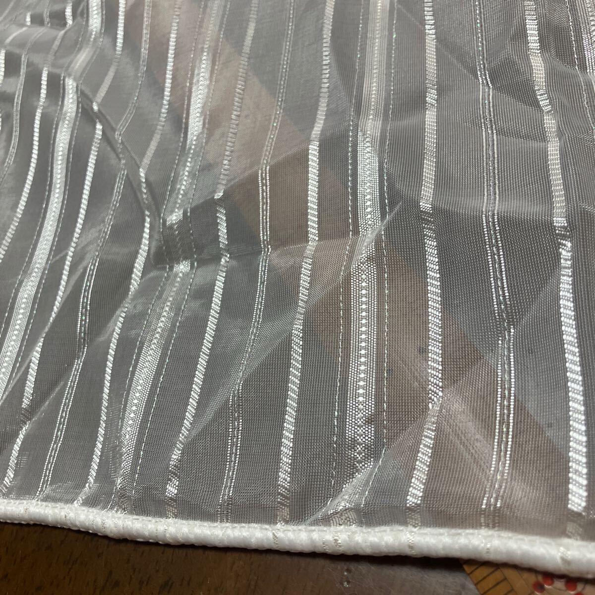 はぎれ ウエスト付き輸入ストライプ レース生地です。ベージュです。光沢のあるストライプレースがゴージャスなレースカーテンのはぎれです。カフェカーテン、のれんなどインテリア小物に最適です。はぎれです。