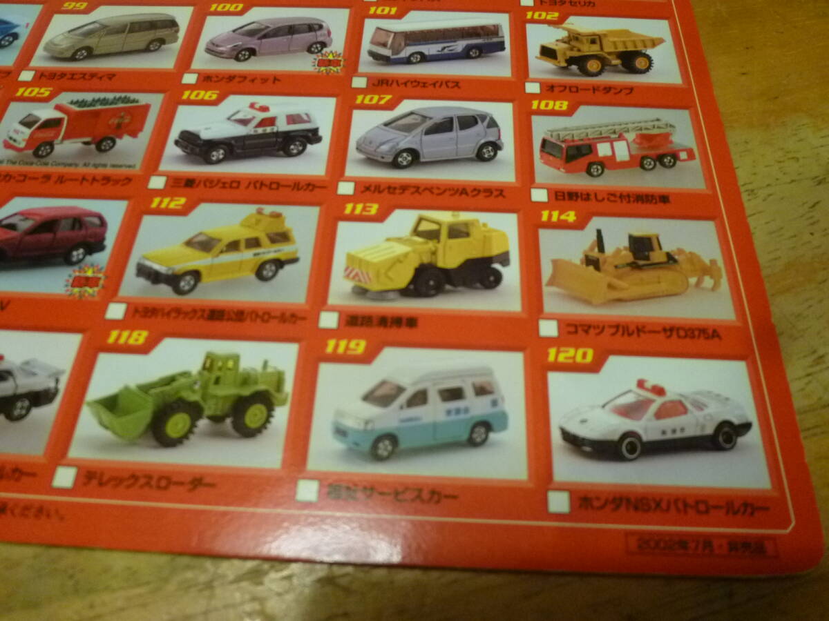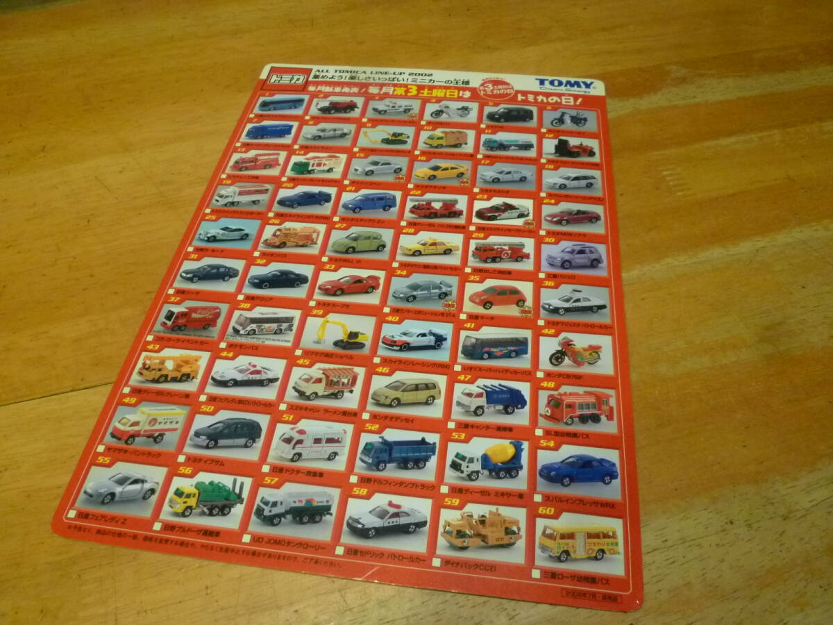 こちらはお子様が大好きなトミカで、その2002年のオールトミカ ラインアップ 一覧表の様です。毎月新車発表! 毎月第3土曜日はトミカの日!等ともあり裏表で、№1の三菱ふそうエアロクィーン~№120のホンダNSXパトロールカーまで載っていて、2002・7月・非売品とあります。