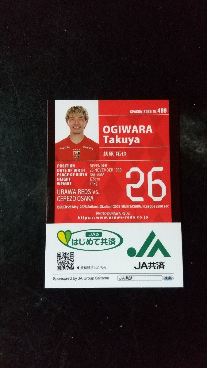 2025年の浦和レッズのマッチデーカードの荻原拓也選手になります。カードスリーブと硬質のカードケースに入れて発送いたします。新品になりますのでノークレーム、ノーリターン、ノーキャンセルでお願いします。